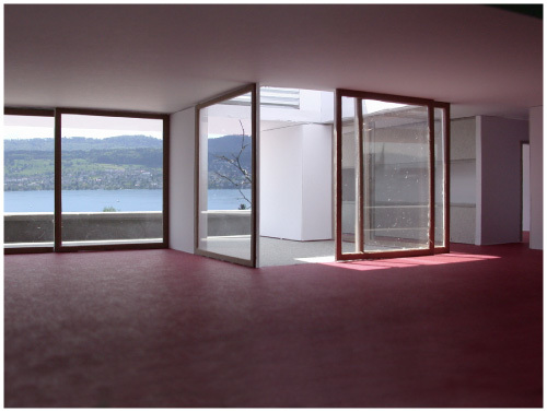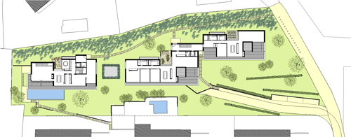 Arealüberbauung mit grosszügigem Einfamilienhaus und vier Eigentumswohnungen. Die Bebauung schmiegt sich flach und langgezogen entlang der nördlichen Grundstücksgrenze an den Hang. So entsteht maximale Distanz zu den unteren Nachbarn bei optimaler Aussichtshöhe.