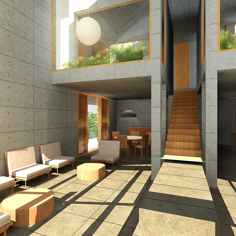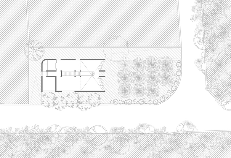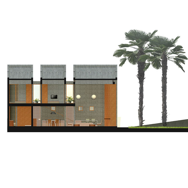A proposal with an inherent paradox, a small weekend house  for a large family on a small piece of land prompted us to look at the existing rural typology. The contrast in the brief lead us to develop the house as a small barn house, prevalent in the backyards of the large main houses in that region; leaving  open yard in front.  The ground floor with small footprint expands in volume to merge with the yard in front  through tall doors along its length. The yard is planted with coconut trees at close distance, which can grow tall to form a large seamless canopy  as an extension to the roof of the house and yet leave a lot of space for children to run around its slender trunks and people to laze about in the sunny afternoons. The coconut trees also blend with the surrounding orchards in this seaside village. The upper floors are seen  as  compact pavillions to merely rest and rejuvenate; where the plants, breeze and the light sway by from different sides.