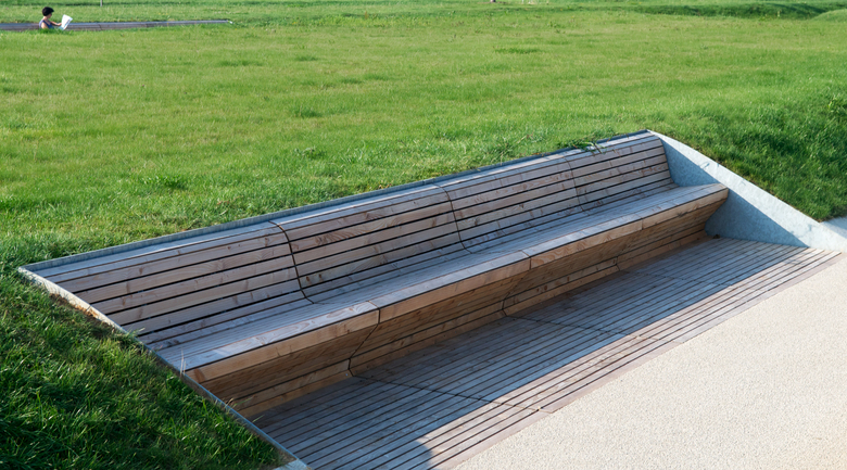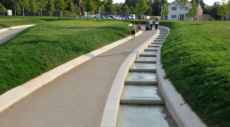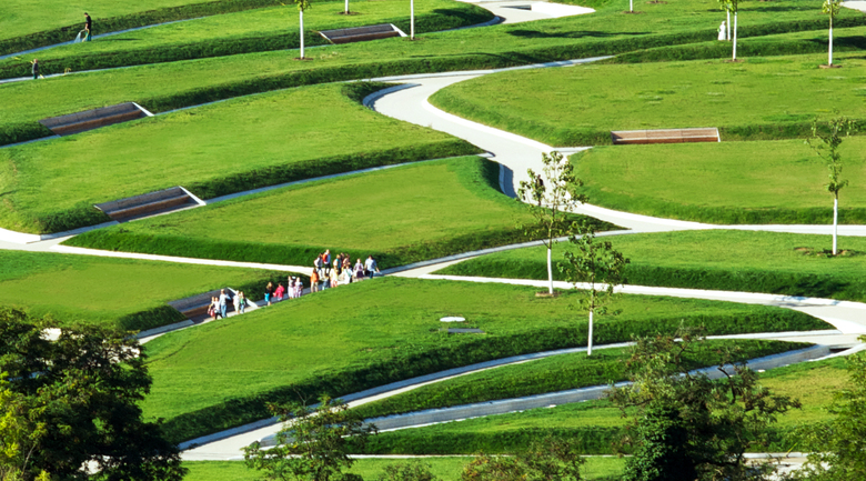 Aber es entsteht auch eine Landschaft, die von der gekonnten Illusion lebt. Die Verfremdung der gewohnten Umgebung durch die Anhebung der Topographie und dazwischen eingeschnittene Wege, erzeugt ein überraschendes Spiel mit der Wahrnehmung von Raum und dem menschlichen Maßstab. Einerseits die Bezugnahme auf die soziale und naturräumliche Vergangenheit des Orts in Form von Neuinterpretation des Themas Steinbruch, Wellen, Wildnis und drüber hinaus mit Hilfe der Überformung der gewohnten Sichtweisen das Auslösen neuer Sinneseindrücke, darin liegt die Innovation der zukunftsorientierten Gestaltung.