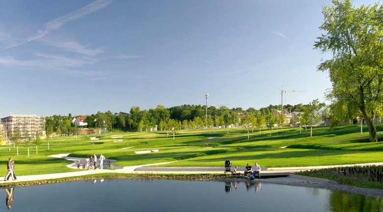 Feuerbacher Heide – Die Feuerbacher Heide bleibt in ihrem Charakter als offene Landschaft erhalten. Die Hügel werden hier in reduzierter Form ausgebildet. Ein großer Teil der Stellplätze für den Tennisclub und Besucher des Parks werden beibehalten.