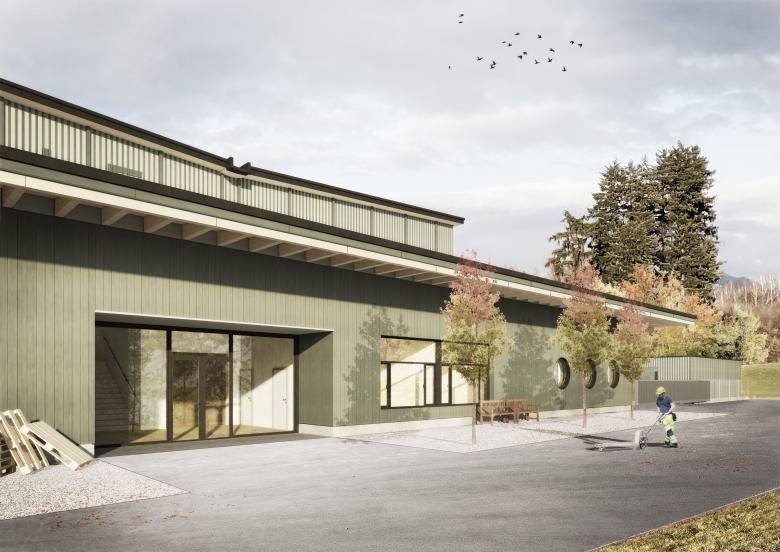 optimal gerecht werden und dabei grosszügige Lagerflächen für Requisiten im Estrich bereitstellen. Das Holztragwerk aus V-Stützen und Trägern überspannt die Halle in Ost-West Richtung und schafft stützenfreie Fahrgassen für LKWs und Mannschaftswagen des Circus KNIE. Das auskragende Vordach rund um das Gebäude schützt die Fassaden und schafft einen überdachten Aussenbereich für die Werkstätten. Die zurückhaltende Holzfassade, die extensive Dachbegrünung sowie die gezielten Massnahmen in der Umgebungsgestaltung schaffen eine angemessene Einbettung des Winterquartiers in die landschaftliche Umgebung.