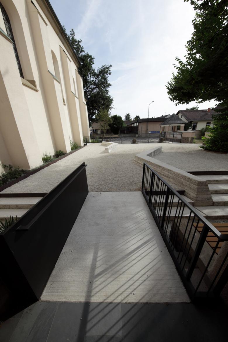 Der neue Kirchplatz als geneigte Fläche erschliesst die unterschiedlichen Eingänge barrierefrei.
