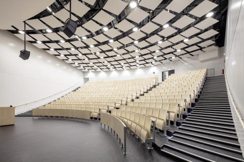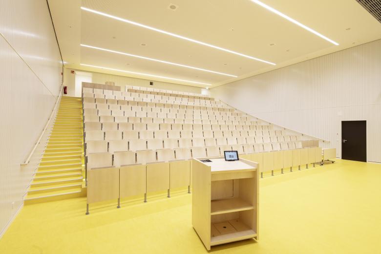 Das gestalterische Grundthema des Hell-Dunkel-Kontrasts setzten wir auch in den Innenräumen fort – ergänzt um markante Akzente in Gelb sowie hellem Ahornholz. So betreten die Nutzerinnen und Nutzer das Gebäude durch einen gelben Windfang inklusive gelb getönter Scheiben, auch ein Großteil des Entrees wird durch gelbe Böden und Wände geprägt. Von hier aus schließen sich eine Magistrale als Querverbindung, sowie die Hörsäle an. Diese sind durch weiße Wände mit diversen schwarzen Flächenanteilen und einer großformatigen Beschriftung in klarer Typographie gekennzeichnet. Gerade vor Seminarräumen oder den verschiedenen Hörsaal-Eingängen haben wir Aufenthaltsinseln eingestreut, die sich durch einen kontrastierenden dunklen Bodenbelag gegenüber der allgemeinen hellgrauen Beschichtung mit eingestreuten Silberflakes abheben. Besondere Highlights sind die Hörsäle.