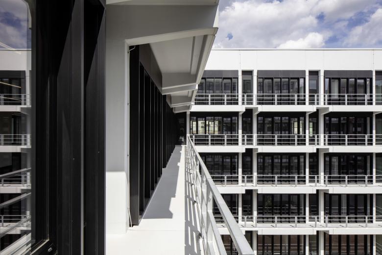 Grundsätzlich erhielten wir die konstruktive Struktur des Gebäudes und auch seine 60er-Jahre-typischen, vorgelagerten Balkone. Jedoch haben diese heute keine Fluchtwegfunktion mehr und dienen nur noch der Wartung. Die gesamte Fassade bekam ein komplett neues Gesicht: Mit großflächigen schwarzen Fenstern und weißen Betonteilen setzt sie auf klare Kontraste und ein stark grafisches Bild. Die Giebelseiten der Gebäude erhielten zudem eine vorgehängte Metallverkleidung. Auch funktional brachten wir die Fassaden auf einen zeitgemäßen Stand, mit außenliegendem Sonnenschutz und innenliegendem Blendschutz.