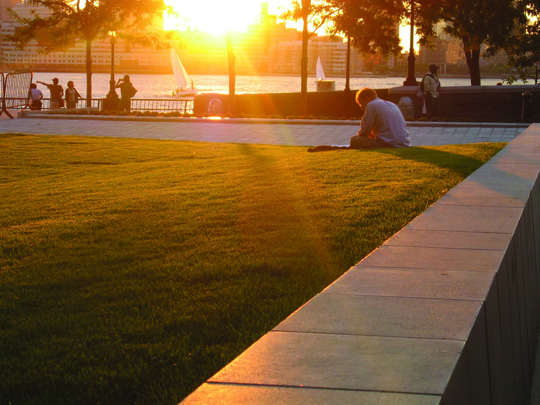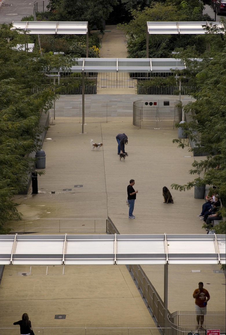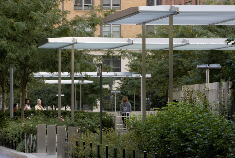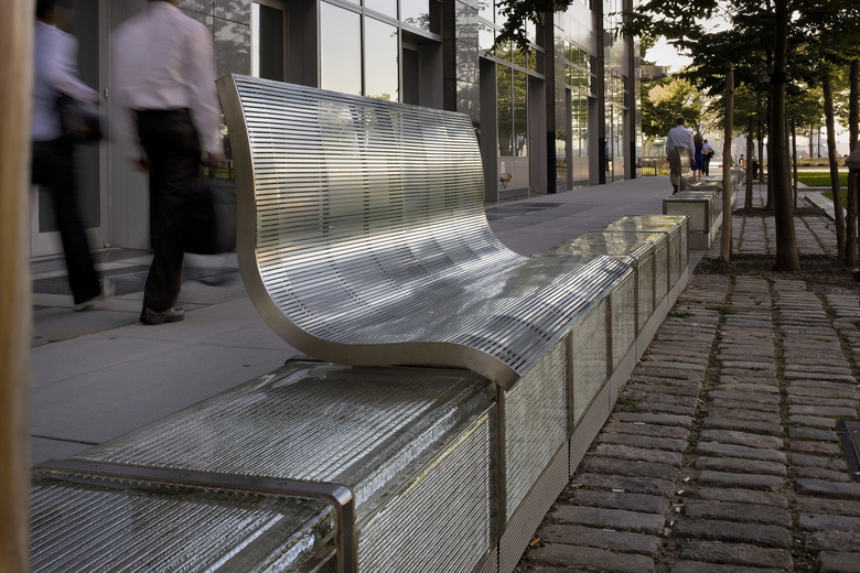 Rogers Partners provided enhanced pedestrian connections to public spaces and amenities and created a new identity for this residential, business and touristic neighborhood along the Hudson River in Manhattan and across from the World Trade Center site. Illuminated bench seating, glowing glass shade canopies, a plant nursery, grass covered berms and paving variety create gracious pedestrian areas. Designed to offer more beautiful and enjoyable experiences by day or night, the Battery Park City streetscape welcomes people on their way to work, strolling along in awe of the Statue of Liberty at sunset, on a morning run or out to catch a water taxi.