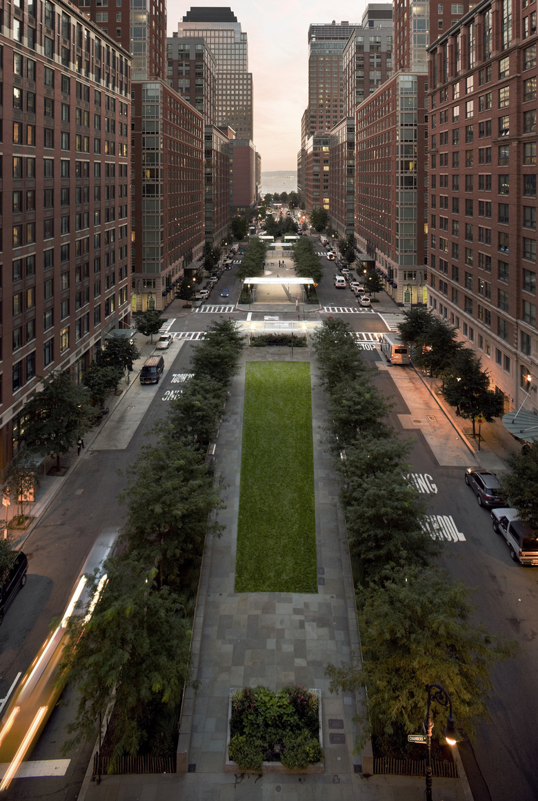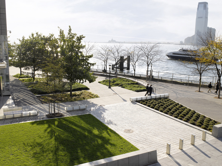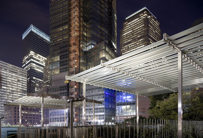 The project integrates much needed neighborhood amenities with security considerations throughout the North Neighborhood and World Financial Center. Security is seamlessly integrated into the urban fabric at all scales, from urban planning to material details. At the neighborhood scale, the design solution adjusts curb lines, changes traffic patterns, and re-assigns neighborhood streets to reduce vehicular speeds approaching sensitive financial institutions. Landscape provides security for nearby buildings: a combination of earth-backed walls, grass-covered berms, and collapsible paving systems do double duty as pedestrian zones and perimeter security.