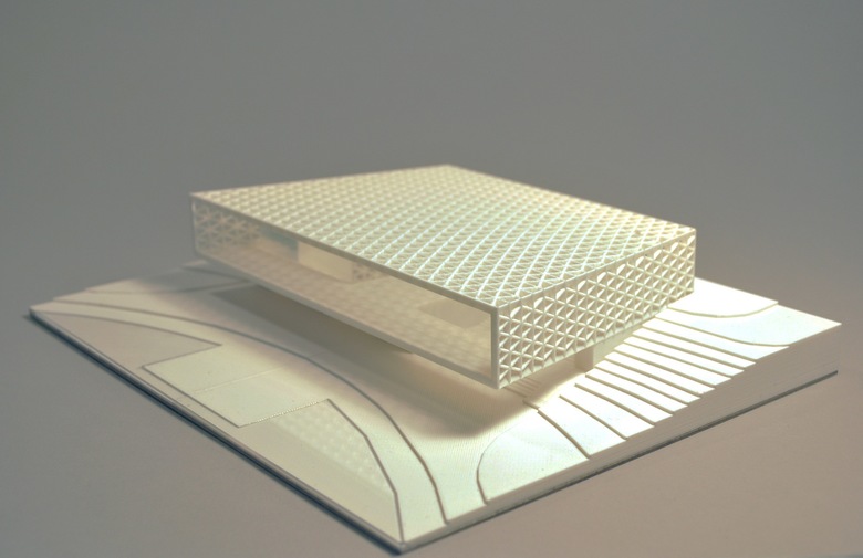 An equilateral grid envelope defines the pavilion as a space yet a part of the landscape. From scale to massing and materials, the pavilion is designed to integrate into the landscape, to entice and protect without obscuring. Like the landscape, it is contemporary in form and tectonics.