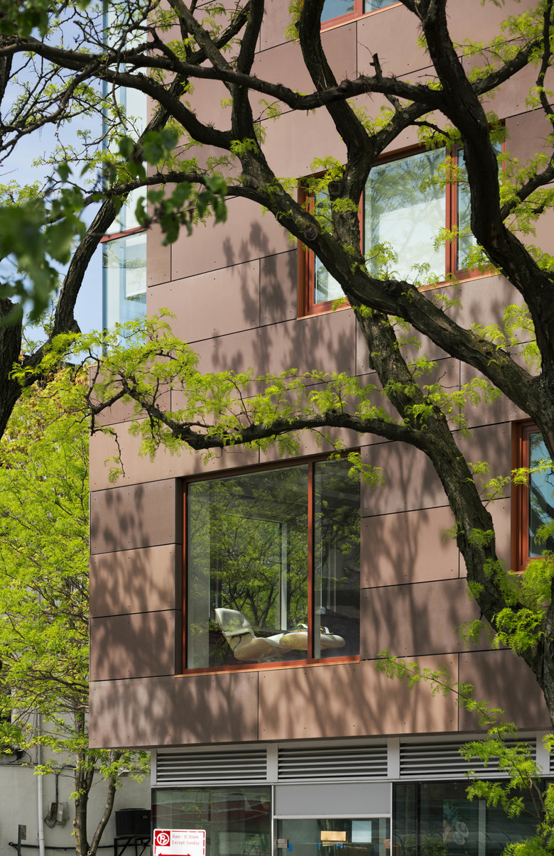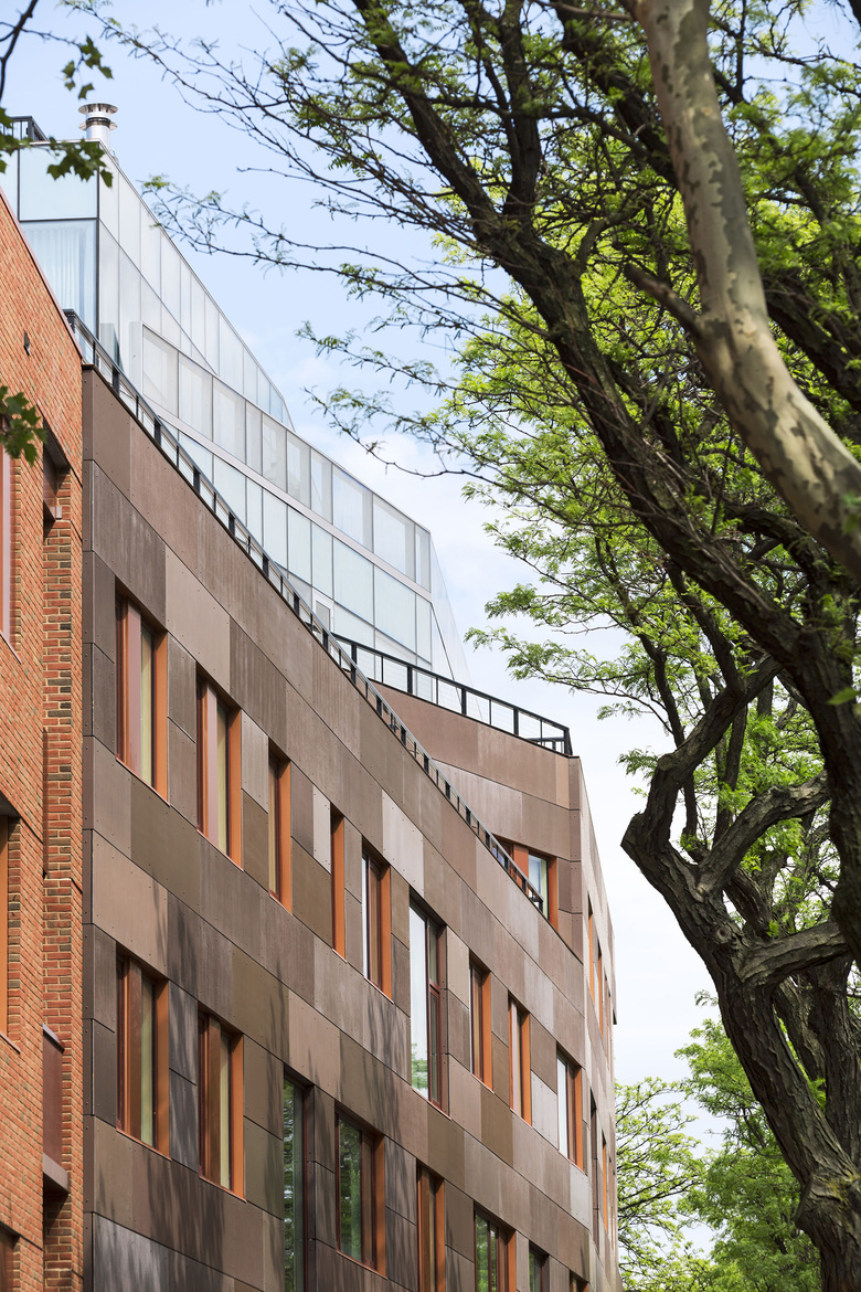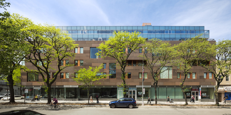 In addition, to address community concerns regarding the impact of a new development on the character and culture of the area, the scale and material selection were carefully considered during the design process. The brick facades on the lower level continue and hold the material palette and scale of the neighborhood, while the window glazing on the top two loft floors demarcate the material line and are set-back to reduce the bulk of the building from the street. In addition to helping maintain the neighborhood scale, this voluntary set-back, at the 6th floor, resulted in additional terrace spaces and penthouse units. The window pattern reflects the diversity of window sizes, representative of the mix of commercial and housing types, seen in a typical block in New York City.