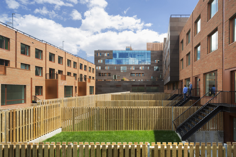 As one of the first new, residential buildings in the Carroll Gardens neighborhood, Sackett Union, Alchemy Properties Inc.’s latest development, was designed to complement the fabric of the historic neighborhood while providing a modern take on the organically mixed apartment developments of 19th century New York City and its boroughs. Sackett Union, a seven-story, 140,000-sf mixed-use development featuring 32 distinct condominium residences, 11 townhomes, and commercial and community facility, includes a variety of residential units offering many family-friendly options. To invoke a house-like feel, the condominiums utilize a split-level, interlocking design with master bedrooms on the upper floors. The townhouses include both single and multi-family which have double height spaces on the garden. With four units located along Union Street and seven units on Sackett Street, some of the townhouses include portions that can be rented out by the owner. Three of the 32 residential units facing units on Union Street are individually accessed maisionettes. Each of these units has an approximately 40-foot rear yard located at the ground floor behind comprised of concrete pavers and lawn.