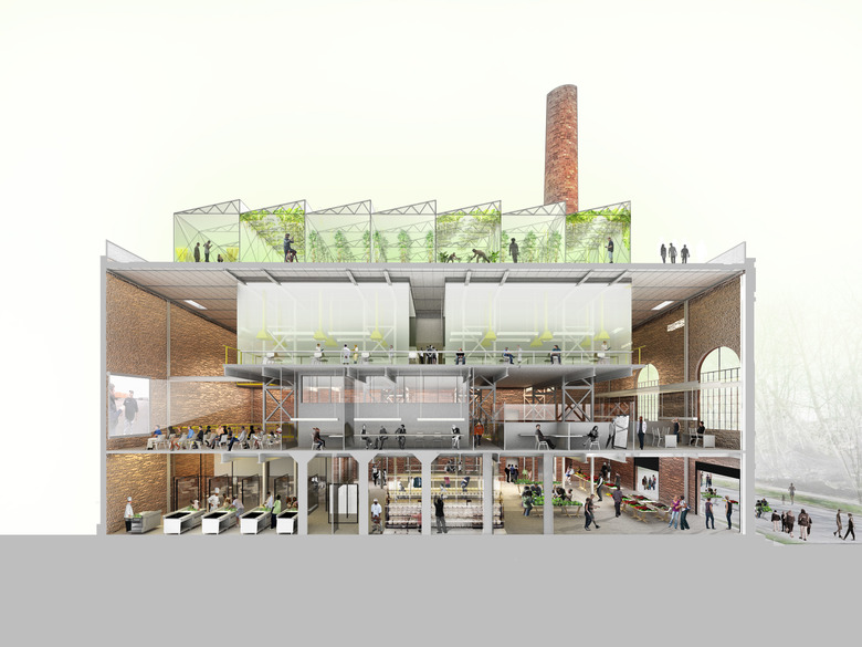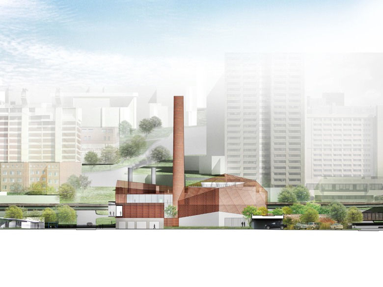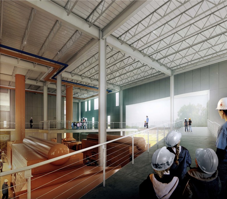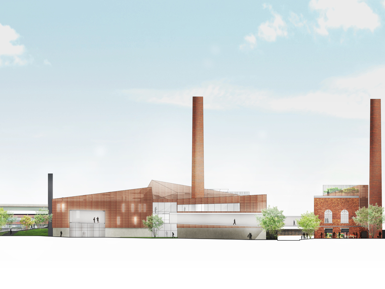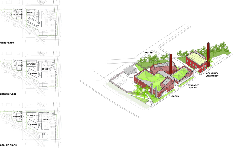 The project includes a new cogeneration plant, chiller plant, storage facility and offices; the obsolete 1926 Steam Station is gutted and repurposed for academic and community use. A green market, teaching kitchen, and community rooms fill the ground floor and engage the street; the upper floors house classrooms, offices, and laboratories. Greenhouses, warmed with the cogen plant’s waste heat, occupy the roof. An elevated public path – the Education Loop – snakes through the entire complex. The plant becomes a neighborhood asset where power plant workers, students, and the local community work, meet, mingle, learn, garden, cook, and eat. From the neighborhood and the highway, the Energy Campus serves as a beacon and symbol of the University’s commitment to sustainability.