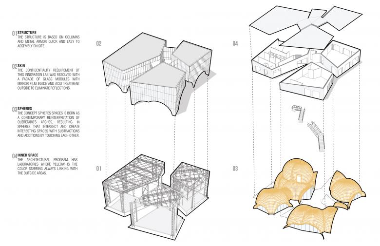 In his “Atlantida de hormigón”, Reyner Banham posits “a casual connection, conscious and cultural, between modern architecture and industrial utilitarian structures of an industrial epoch”. From Loos and Berhens to Gropius and Le Corbusier among others, in the beginning of the 20th century, a constant back and forth was established between architecture and industrial construction - up until this time marginalized in Architecture - that would continue to be a characteristic of contemporary architecture. To reinvent the industrial world was a task with which architecture had paid back the favor of having been shown the path as to how to disengage of the heavy formal and stylistically weight of almost two centuries of vacuous rhetoric and ecclesiastic academicism. To reinvent, is understood, as the invention of an image which moves between the operative logic and the logotype. Between this, lays the work that Rojkind arquitectos has done for a pair of factory additions for the Nestlé Company. The first commission consists of a vestibule for one of its chocolate factories in the outskirts of Toluca, near Mexico City; it is a structure of sloped plains attached to the existing factory that will serve as the central core for a future museum. The second commission located in Queretaro’s industrial zone, is a laboratory for development of new products, packaging center and a satellite office for its product technology center located in Maryville which focuses on the development of new drinking products. This latter commission presented an additional challenge besides its relationship with the existing facility. The UNESCO’s designation of Queretaro’s historic city center as a world heritage site in 1996, had unforeseen consequences that even expanded to the city’s industrial periphery. As a result of this designation, the new building was to have an arched porch, as rooted in tradition. Rojkind responded to this challenge with a reinterpretation not only of the arch but also of the porch. If the arch is nothing else than a fragment of a cupola, in the same vein, the cupola is an amplified arch when it rotates around its own axis, the cupola meets the reference criteria of the arch without turning it into a cliché. In this case, a series of spheres intersect and multiply like foam forming the origin of a continuous open space; a portico. This space expands while another one, made of orthogonal boxes clad in satin mirrored glass, restrains the proliferation of the spheres and houses the specific program requirements for the lab. While the exterior is opaque, metallic and impenetrable in appearance, the interior of these boxes painted in different colors, have an almost theatrical quality to them: it appears as if the researchers wearing their white robes were floating in a continuous flow of blues, yellows or greens which are interrupted by the continuous space of different colors sometimes, when one of the of the metal panels that covers the boxes reveals itself and opens like a window, they can be seen from the outside. The construction of these buildings (if built in a different latitude, a more sophisticated technology most likely would have had been employed to automatize the production of the unique geometries of these spheres) implied the translation of spatial forms was to be done in a different constructive manner, in a simple almost colloquial way, which allowed the local workers to fabricate the foam like spherical space from the physical intersection of the spherical cupolas made of rebar rings and arches. The final result is a series of contrasts that has been unified with apparent simplicity: the exterior metallic slightly reflective satin color lightly contrasts with and against the bright and satin colors of the interiors, the sloped abstracted planes of the boxes contrast against the exuberance of the interweaving spheres. The strength of this project might be attributed to this game of contrasting opposites, which in a dynamic and changing way depending from the physical view of the observer, can be a dominant characteristic in a moment or a discrete characteristic in another. A rethought and recharged industrial construction thus regains an understanding of what at one time it offered to Architecture: clarity and force.