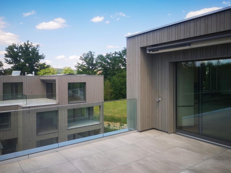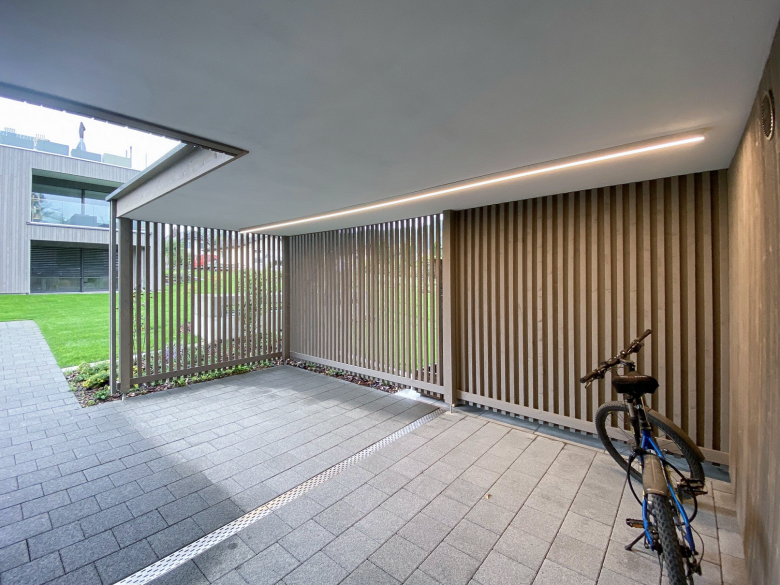 Am südöstlichen Dorfrand unmittelbar an der Landwirtschaftszone stehen die zwei Mehrfamilienhäuser mit je 8 Wohnungen. Nördlich des Parzellenrandes fliesst der Aabach vorbei. Als Splitt Level folgen die beiden Häuser der abfallenden Topographie Richtung Aabach. Die Holzfassade geht dabei auf die natürliche Umgebung ein. Die Wohnungen sind alle gegen Süden bis Westen ausgerichtet. Die grossen Terrassen der oberen Wohnungen bieten viel Platz für Sonnenhungrige und einen herrlichen Ausblick.