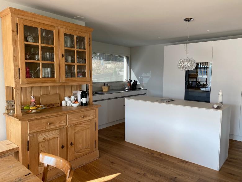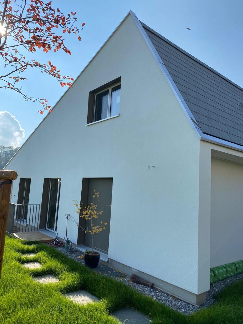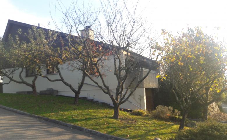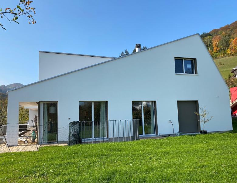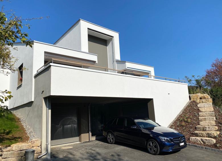 Bei diesem Auftrag handelt es sich um ein Einfamilienhaus aus den 70er Jahren, welches umgebaut und saniert wird. Die Form des Gebäudes soll erhalten bleiben, insbesondere auf dem bestehenden Keller aufgebaut werden. Die Erschliessung geschieht neu talseitig über das Untergeschoss. Im Erdgeschoss sind die Wohnräume mit Küche und Elternschlafzimmer mit Bad angeordnet. Im jetzt ausgebauten Dachraum kommen zwei Zimmer mit eigenem Bad zu liegen. Verbunden werden die Geschosse mit einer zentralen Treppenanlage. Zusätzlich bekommt das Haus eine Schleppgaube über zwei Geschosse, die eine grosszügiges Wohngefühl und viel Licht in die Räume bringt. Die Vordächer werder aufgelöst und führen so zu einer modernen Architektursprache. Die Materialisierung innen und aussen ist bewusst einfach und modern gehalten.
