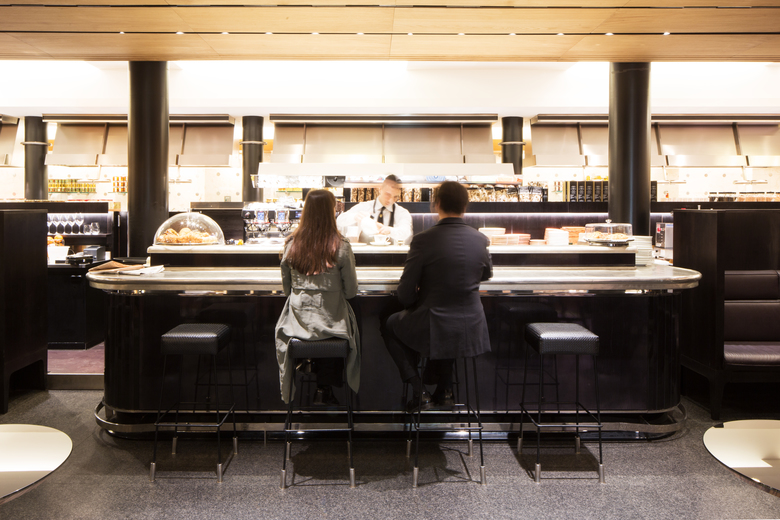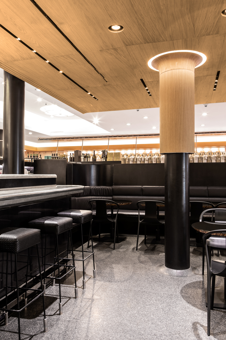 Un piccolo spazio dall'atmosfera viennese con i toni del cioccolato e del miele, che ricordano le origini di PECK che porta a Milano una piccola testimonianza della cultura mitteleuropea. Un teatrino ad anfiteatro disegnato con panche in pelle e al centro un bancone in legno dai riflessi in vetro scuro e zinco, progettato riprendendo un modello analogo del Peck storico.