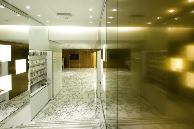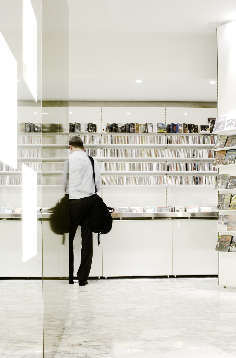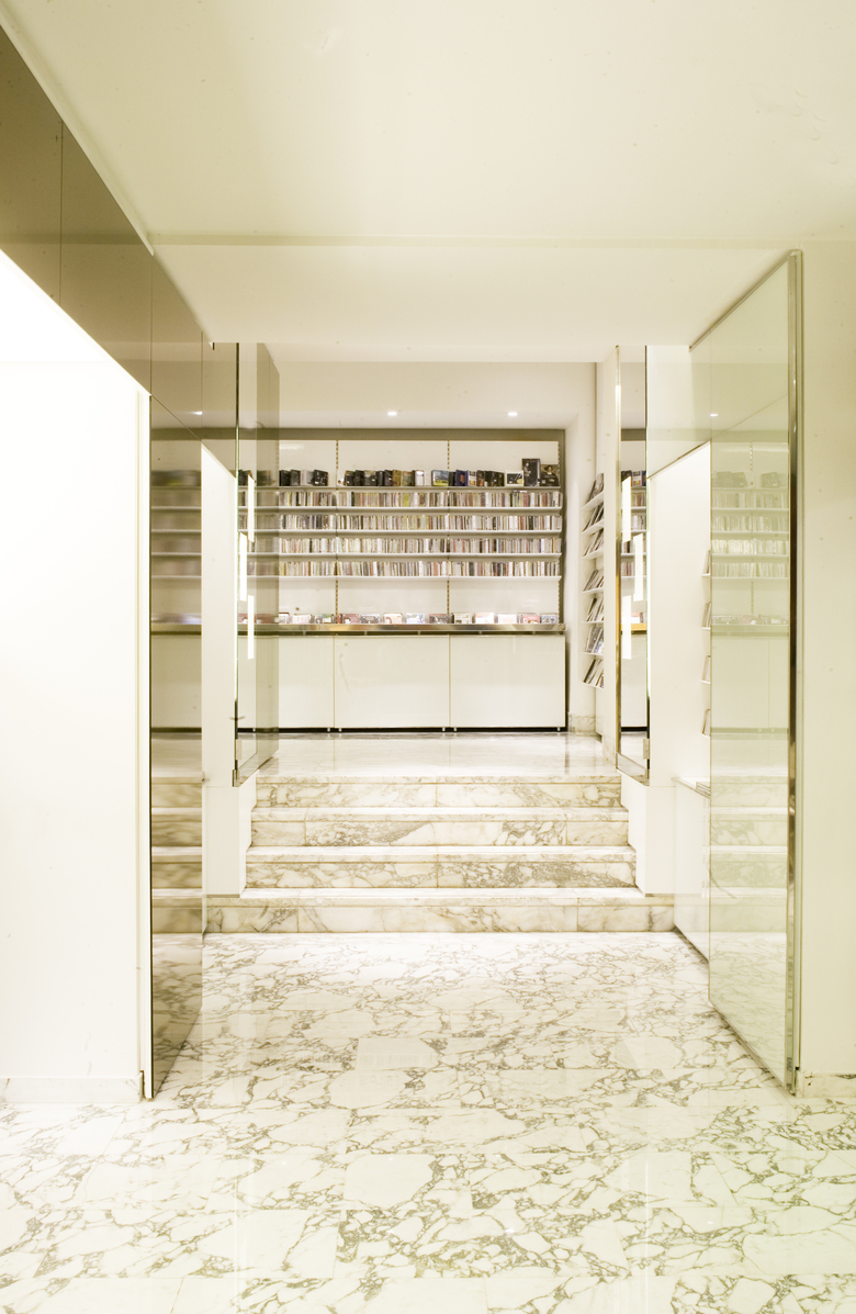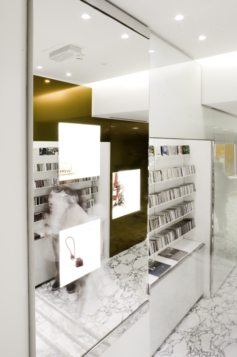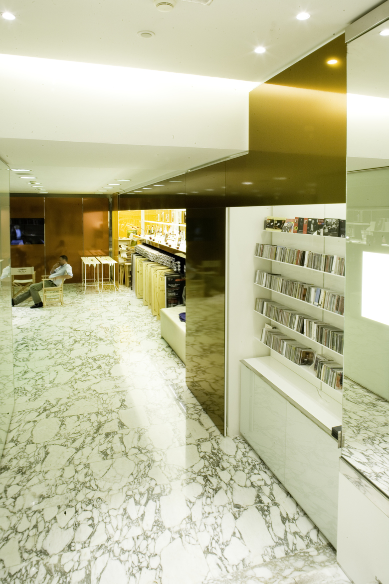 Gli arredi sono disposti per guidare il visitatore in una sorta di promenade all’interno del catalogo musicale, una lunga libreria crea il fondale per chi entra dalla strada e prospettiva verso la porta che conduce al foyer, il grande banco reception, consente di controllare gli spazi del piano, un monitor guida verso la scala che conduce alla sala di ascolto al piano inferiore.