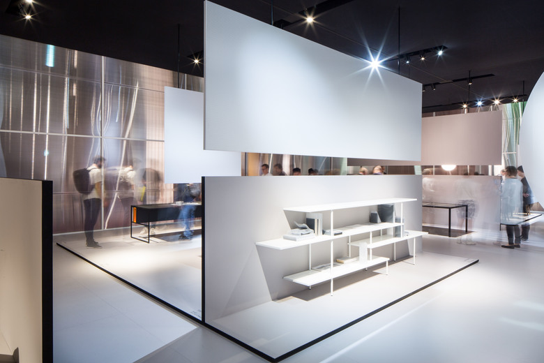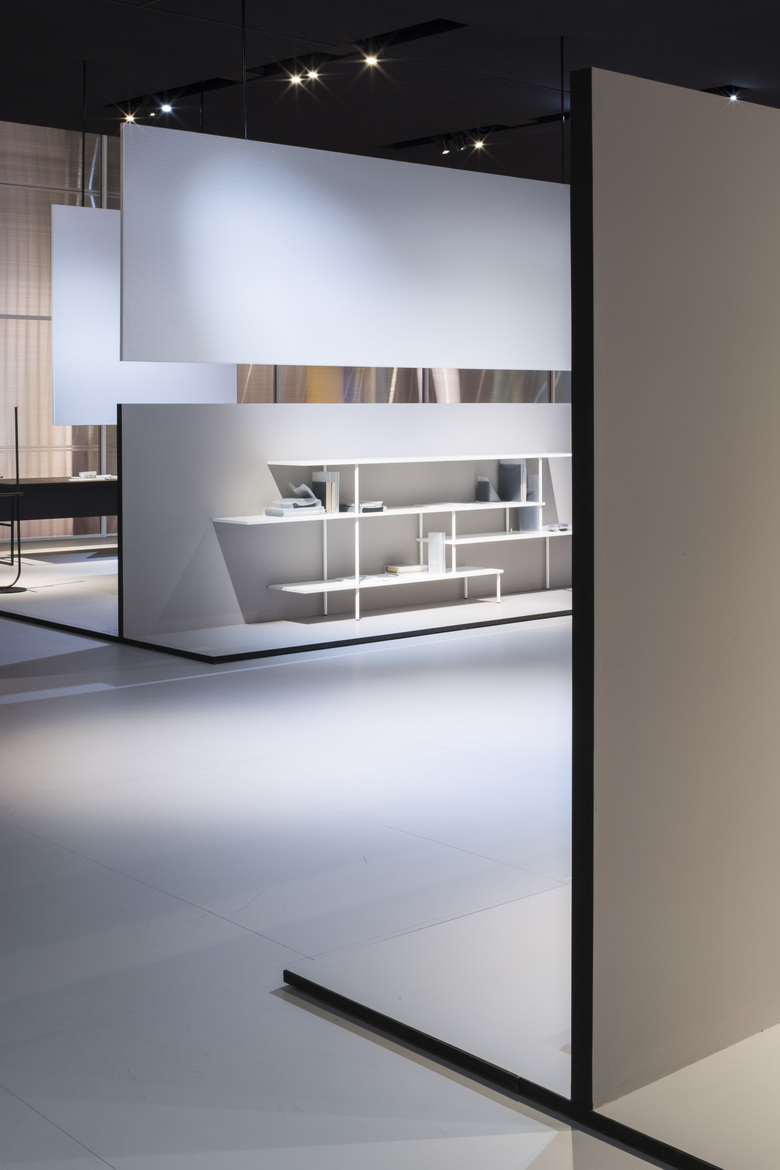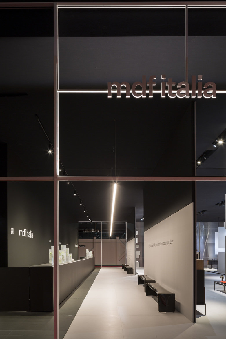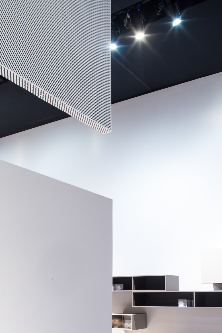 Internamente le scene sono accenni di stanze in continuità l’una con l’altra, una geometria netta e leggibile che lascia spazio agli oggetti MDF Italia. Le linee, le forme e la materia di questi oggetti comprendono un’immagine di leggerezza e semplicità, sostenuta dal rigore e dalla tensione della materia e delle forme nel progetto dello spazio espositivo.