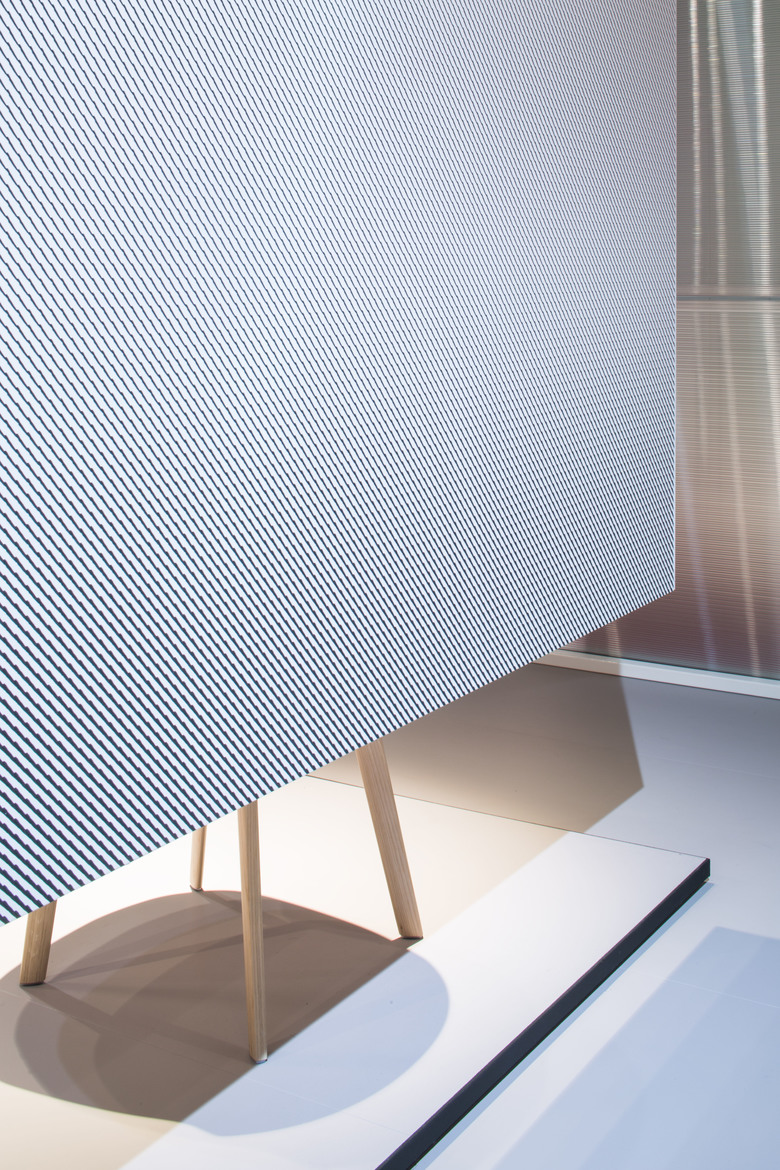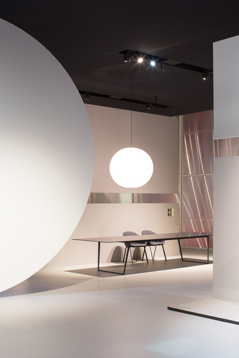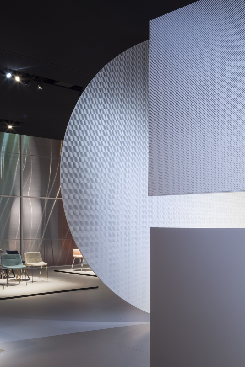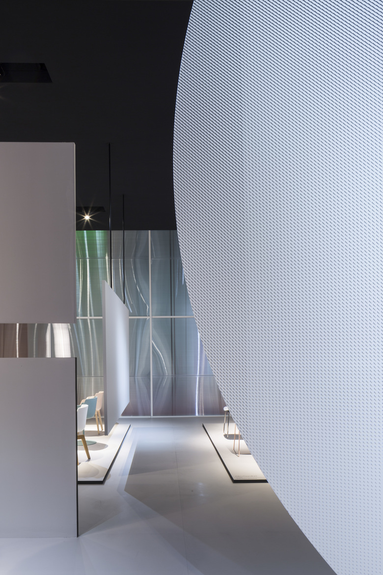 Internamente le scene sono accenni di stanze in continuità l’una con l’altra, una geometria netta e leggibile che lascia spazio agli oggetti MDF Italia. Le linee, le forme e la materia di questi oggetti comprendono un’immagine di leggerezza e semplicità, sostenuta dal rigore e dalla tensione della materia e delle forme nel progetto dello spazio espositivo.