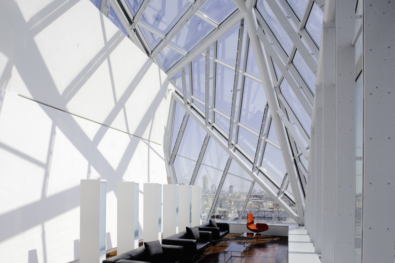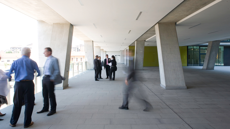 Un ordine gigante di pilastri sostiene direttamente il primo solaio che è quello della piazza sopraelevata, una grande terrazza che si affaccia sul giardino e concentra le funzioni comunitarie aziendali, snodo dei percorsi di distribuzione ai nuclei principali e secondari degli uffici.