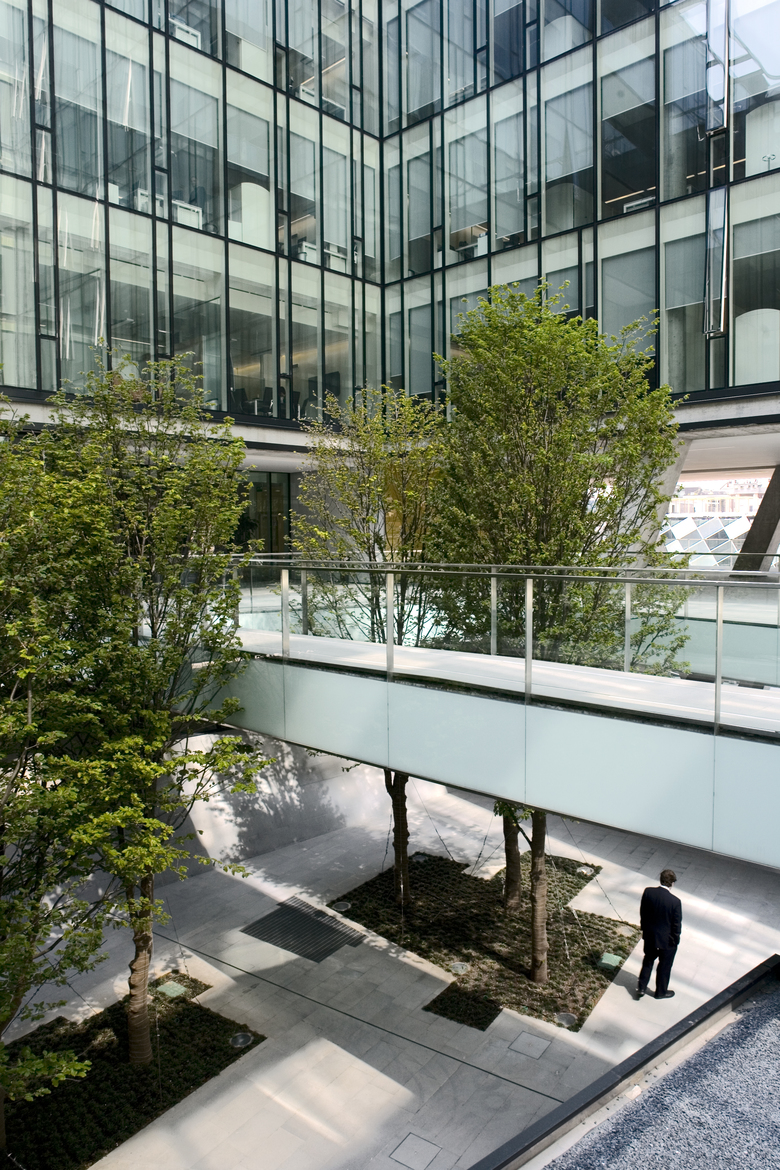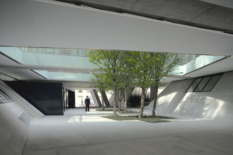 Il basamento è pensato come brano di paesaggio, attraversa fluidamente il soprastante volume, raccorda le diverse quote dell’esistente, integrando gli spazi destinati ad archivio e le funzioni a più stretto contatto con la strada, in un sistema articolato di percorsi che conducono al grande vuoto centrale, un giardino con alberi ad alto fusto sovrastato dalla corte interna. Questo spazio si ispira ai luoghi intermedi piranesiani, spazi interni ed interiori che collegano spazi e tempi diversi.