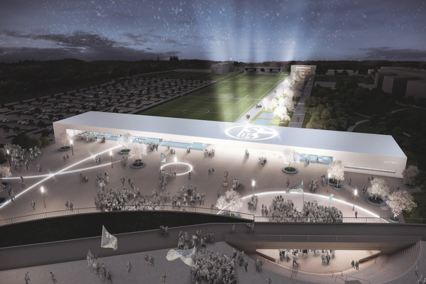 Umbau des gesamten Vereinsgeländes in Gelsenkirchen: Vereinszentrale mit Geschäftsstelle mit Büros, Konferenzbereich und Mensa, Nachwuchs- und Profibereich mit Internat und Hotel, Fan- und Besucherzentrum mit Fanshop (Tor auf Schalke)