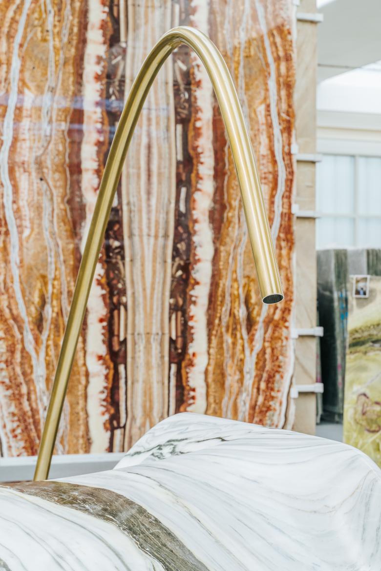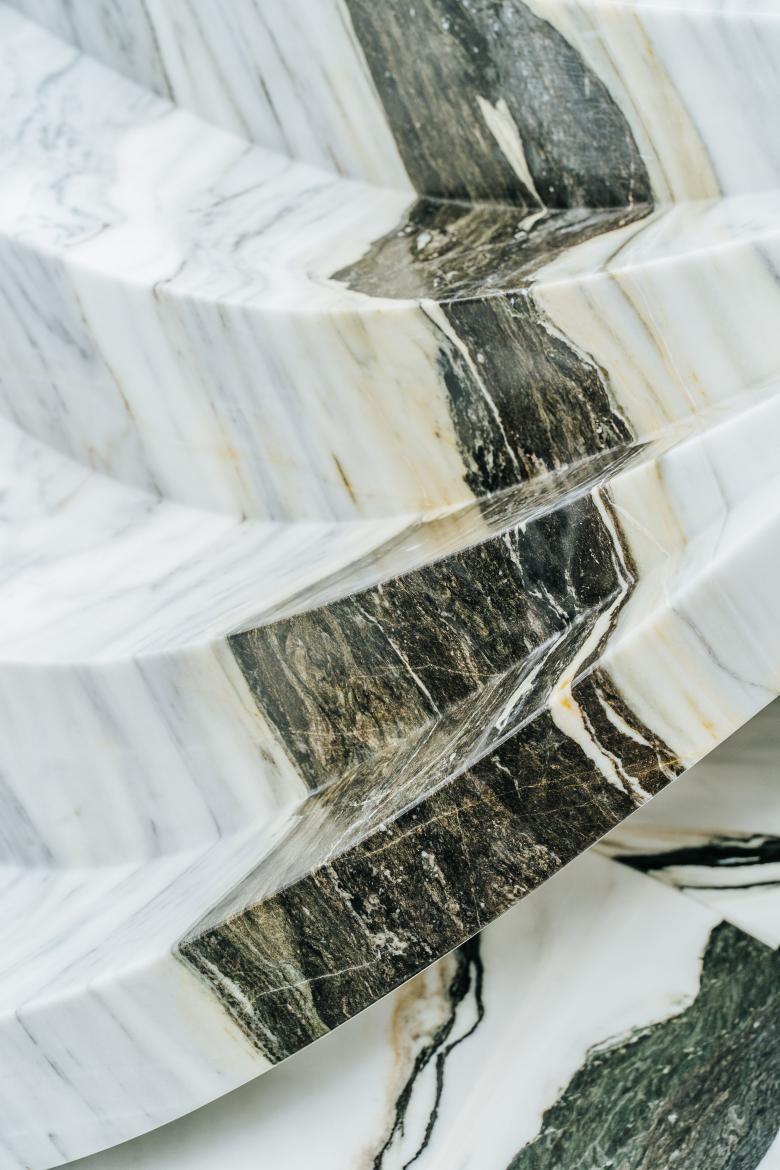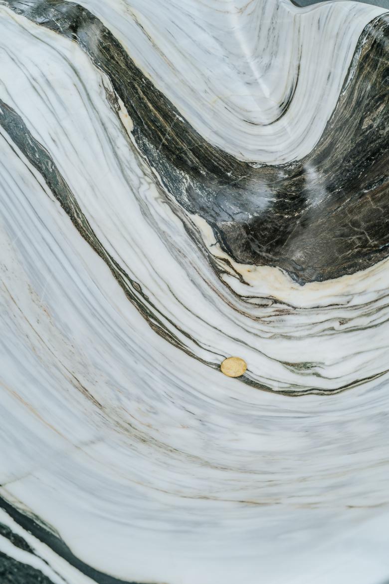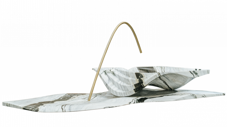 Dieselben Kräfte prägen nun auch die fließenden Formen des Designs der Wanne, formen Schluchten, Klippen und Aushöhlungen holen die Seele des Steins an das Tageslicht. Die weichen Rundungen im Stein sorgen für außergewöhnliche Wassermomente. Fließende Übergänge, Hügel und leichte Höhenunterschiede unterstreichen die Verbindung der Skulptur mit ihrer Funktion – dem Auffangen, Sammeln und Fließen von Wasser durch eine artifizielle Landschaft.
