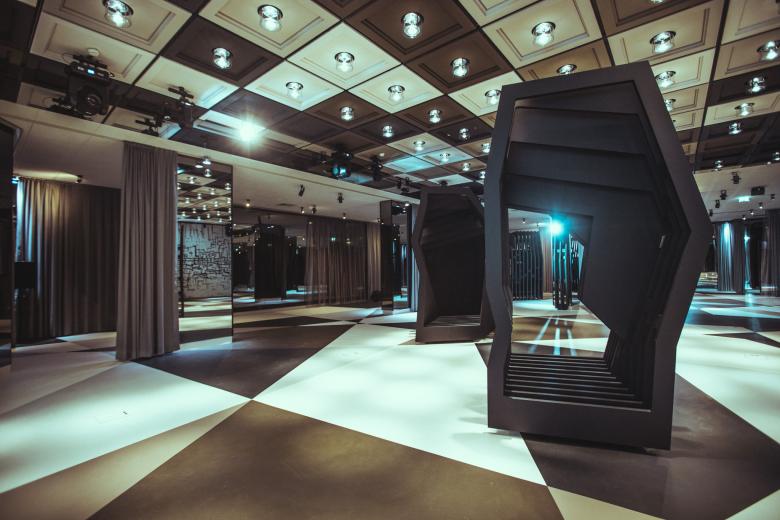 Dreidimensionale, geometrische Blöcke können auf unterschiedlicher Weise kombiniert werden. Sie lassen gebrochenes Licht in den Raum. Es entstehen überraschende, aber auch irritierende optische Effekte, die die Vorstellungen von Bewegungen und optische Täuschungen erzeugen. Die graphischen Elemente spiegeln sich in den großformatigen Spiegeln und so wird das Raumerlebnis nahezu ins unendliche vergrößert. Das Graffiti der Decke bildet einen Bezug zu der Arecibo-Botschaft - eine binär codierte Botschaft, welche Informationen über die Biologie des Menschen enthält.