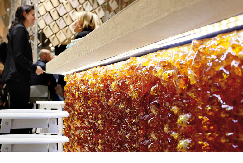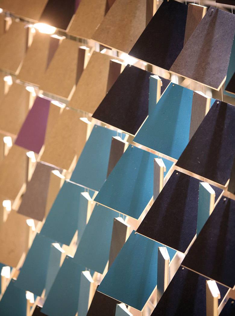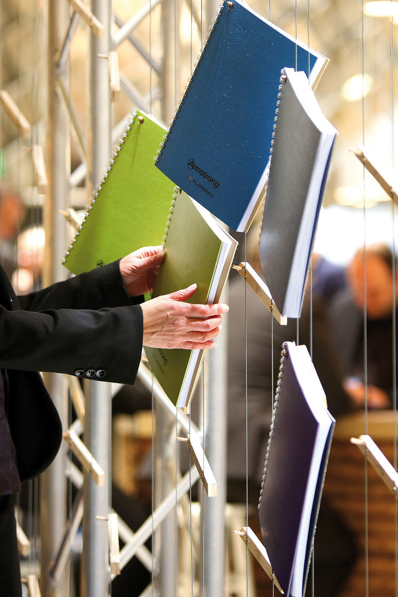Das Raumkonzept von SOMAA. basiert auf der bildhaften Idee eines Baumes, dessen natürlicher Kreislauf aus Wachstum und Verfall, das Nachhaltigkeitsprinzip der präsentierten Produkte widerspiegelt. Die Hülle des Messestands erinnert an ein frisches, flirrendes Blattwerk in verschiedenen farblichen Abstufungen. Sie besteht aus Linoleum eingebundenen Skizzenbüchern, die von den Besuchern herausgelöst und mitgenommen werden können. So lichtet sich die Hülle im Verlauf der Messe und legt das Standinnere frei. Es ist also im besten Sinne ein nachhaltiges Konzept, da die Standhülle nach der Messe ihre Verwendung findet.