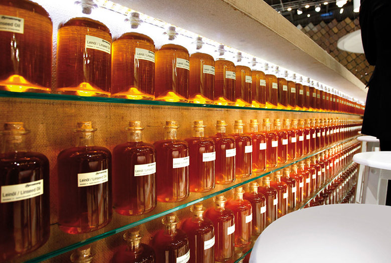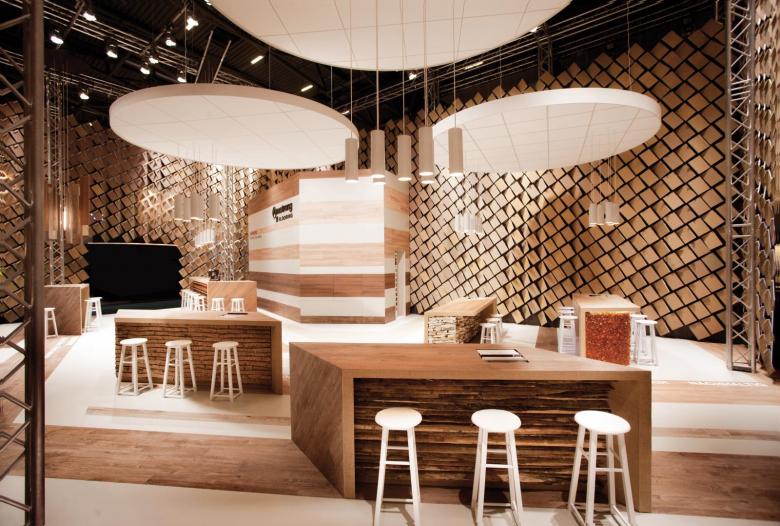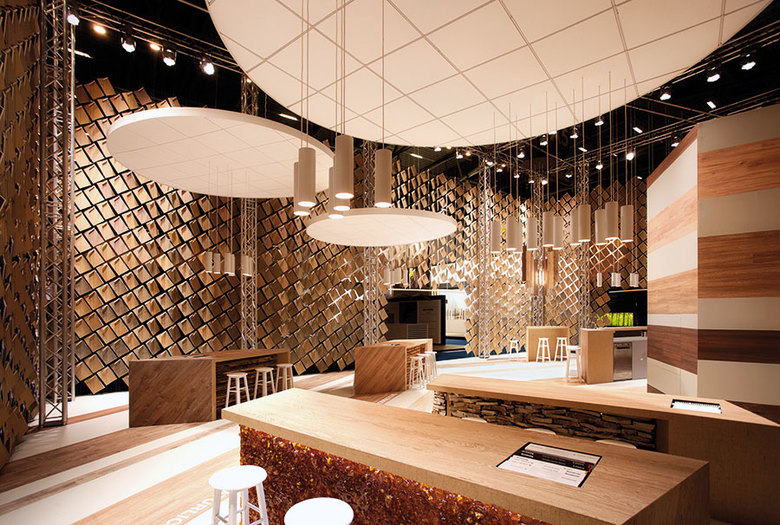 Im Innern zeigt der Stand das abstrahierte Bild eines Baumstammquerschnitts: Wie Jahresringe ziehen sich dynamische Linien und Bänder aus verschiedenen Dekoren des neuen DLW Flooring Bodenbelags „Naturecore“ wie Ober- flächenmuster über alle Standoberflächen. Sie repräsentieren sowohl das Produkt als auch den Nachhaltigkeitsaspekt.