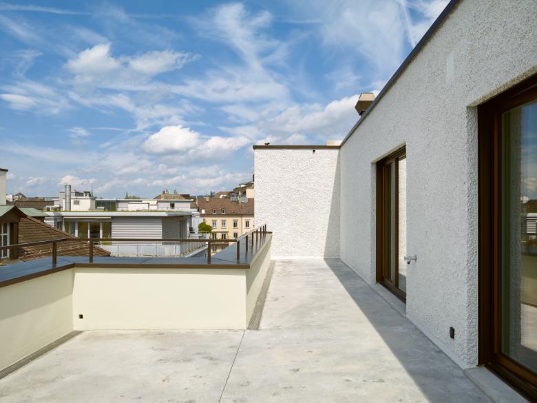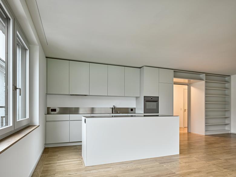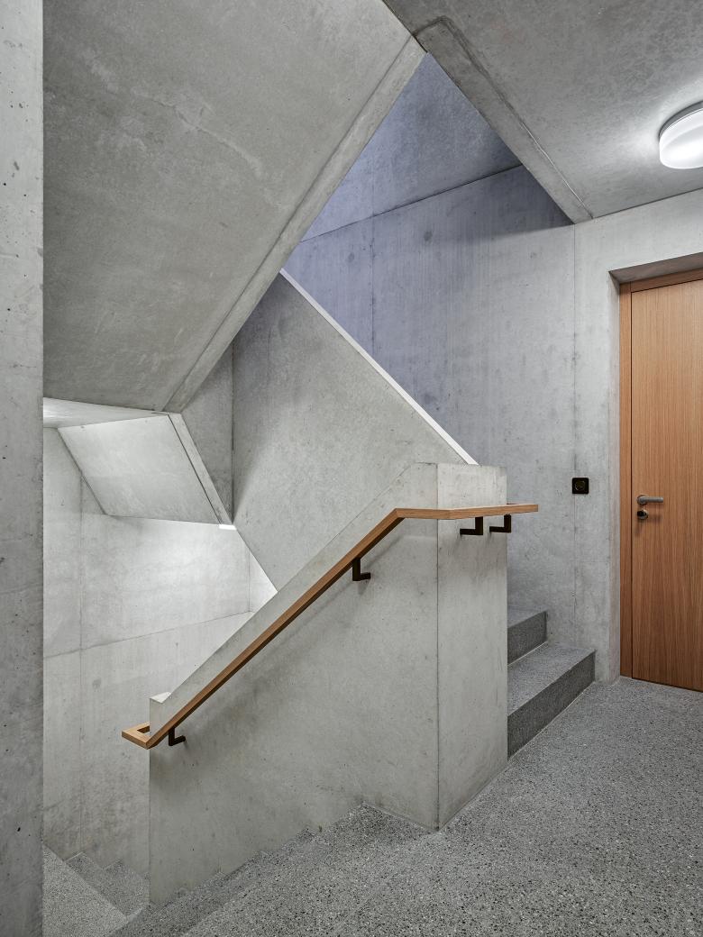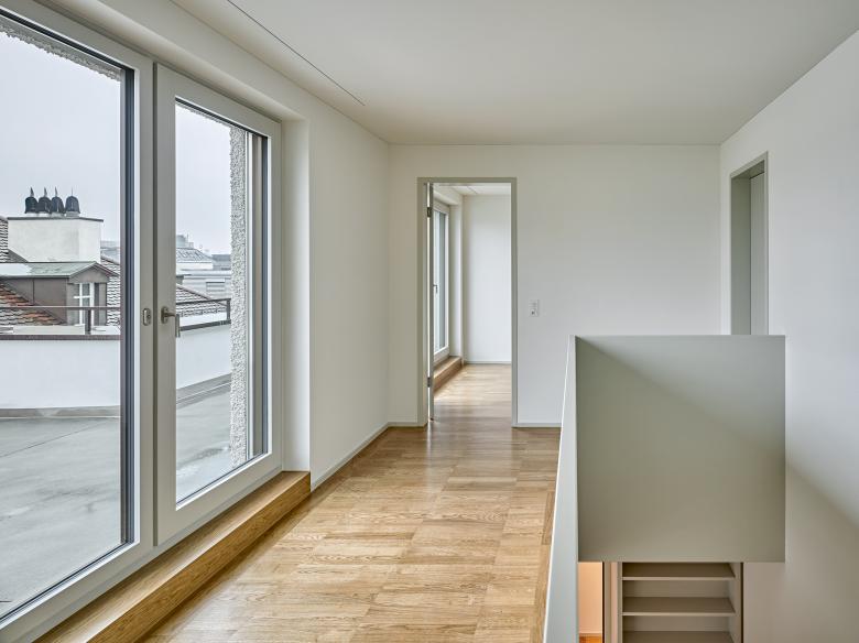 The volumetric concept emerges from the building’s interior: the various room structures nestle around a central concrete core illuminated from above. The flats are entered via a central corridor from which the rooms fan out. A living room measuring over 40 m2 and illuminated on three sides contains a freestanding kitchen placed in the room as a work of carpentry. A large bay window or balcony connects the rooms outwards and spacious terraces extend the duplex penthouse flats into the urban space.
