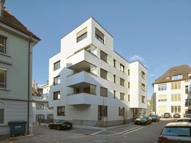 Like force vectors, the apartment building’s irregular spatial structure pushes the projecting bay windows and balconies outward and interlocks with the urban space. The urban structure fits like a hinge into the dense neighbourhood of Zurich’s Seefeld.