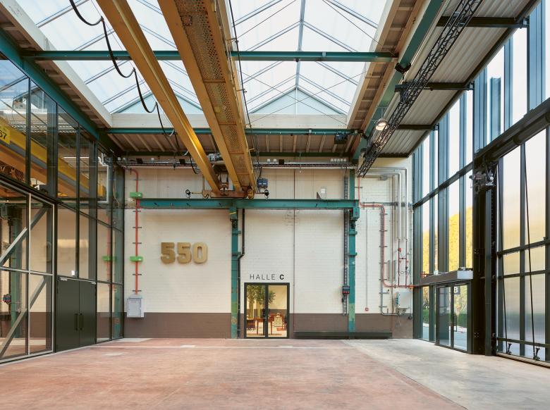 To establish the MFO Park as the neighbourhood’s centre, the halls are shortened and fitted with a temporary façade. A new glass skin allows this urban cut through the industrial architecture to remain visible. At the same time, it transforms the MFO Park halls into a contemporary urban building block with a transparent appearance that opens to the neighbourhood. The two lift doors that dominate the façade emphasize this inviting new public character.