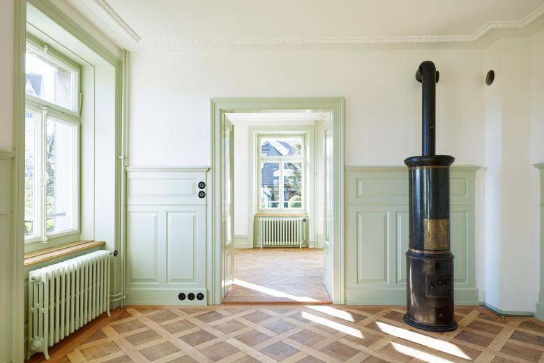 Inside, stucco ceiling mouldings, dadoes, painted imitation wood, some of which is still in its original state, and the careful design of the apartment entrance doors all affirm the historicist approach. All these elements have been carefully restored in accordance with preservation requirements. The roof has been insulated and supplemented with three small windows and most of the original tiles were reinstalled and completed with historical tiles from a conservation warehouse. Spatially, the interventions were limited to the kitchen and bathroom areas on all floors, which have been intentionally designed in keeping with the overall appearance of the historical building. Only the southeast room on the ground floor was modified by partitioning off a narrow space for a cloakroom and a guest toilet.