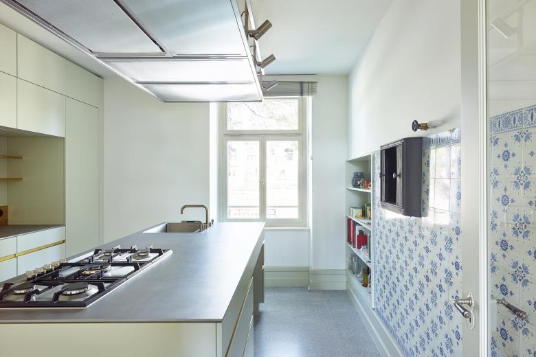 The green which serves as the building’s primary colour and the lincrusta, a deeply embossed wallpaper made of linseed oil and installed in the staircase, resulted from conservation analyses. The historical parquet floors with herringbone and Versailles patterns were sanded and oiled. The dado woodwork was finished in an oil paint brushstroke and the walls with a mineral paint. A seemingly timeless terrazzo and stainless-steel surfaces characterise the design of the kitchen. The bathrooms are lined with Moroccan cement tiles. Graceful green cabinetry, marble-lined washbasins and carefully designed lighting characterise the ethereal bathrooms.
