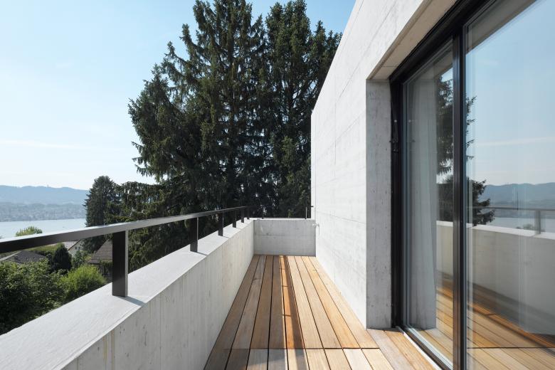 The tapered 500 square-metre property is situated on a ridge on the right bank of Lake Zurich. The structure’s dimensions result from the contracting shape of the plot. The detached house comprises two full storeys with an attic and a basement including an underground car park. The projecting and receding levels of the single-shell concrete construction appear deliberately stacked on top of each other and create balconies with different orientations. The window openings are positioned precisely in the individual rooms to ensure views of the lake and into the distance. A staircase core runs through the structure like a backbone and holds the compact interior layout together.