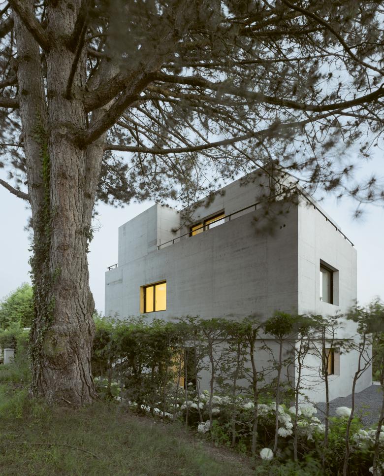 The structure’s heaviness offers presence as a response to the anonymous newer architecture of the area. At the same time, it stands in dialogue with a mighty pine tree adjacent to the building on the slope.