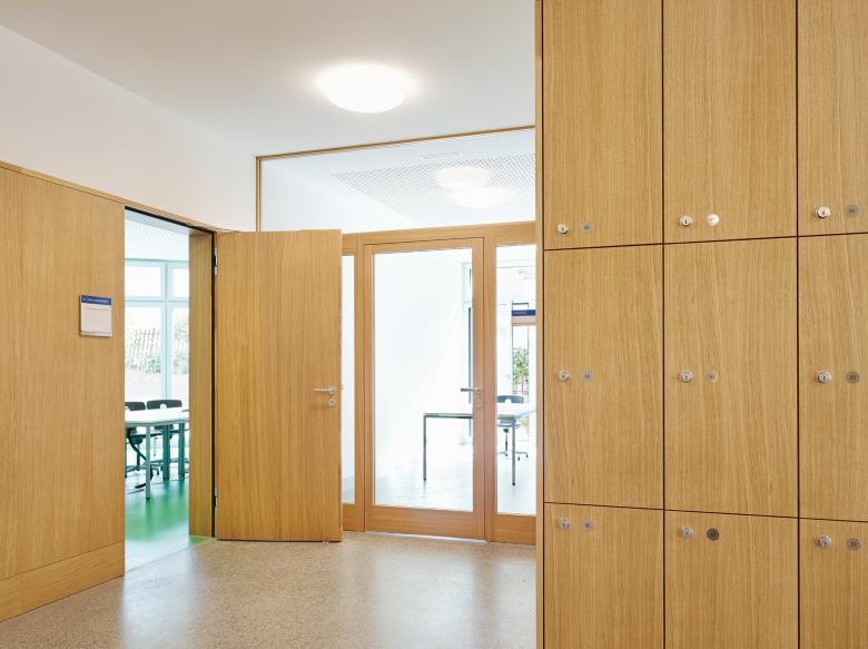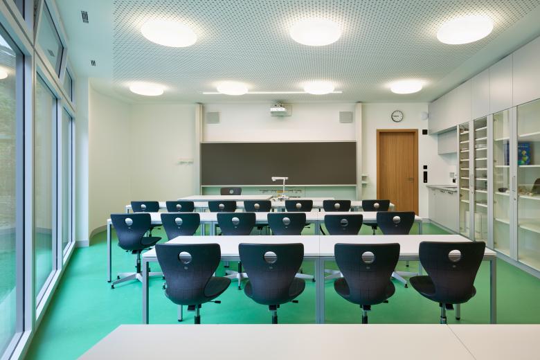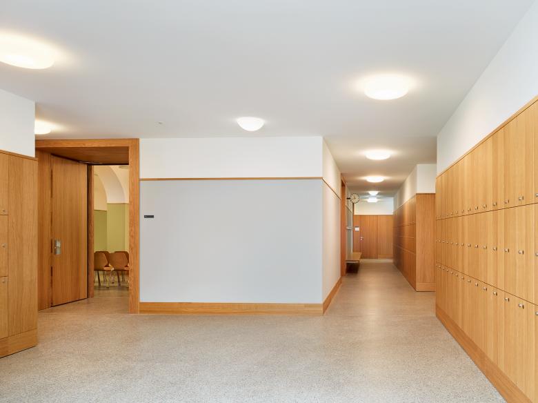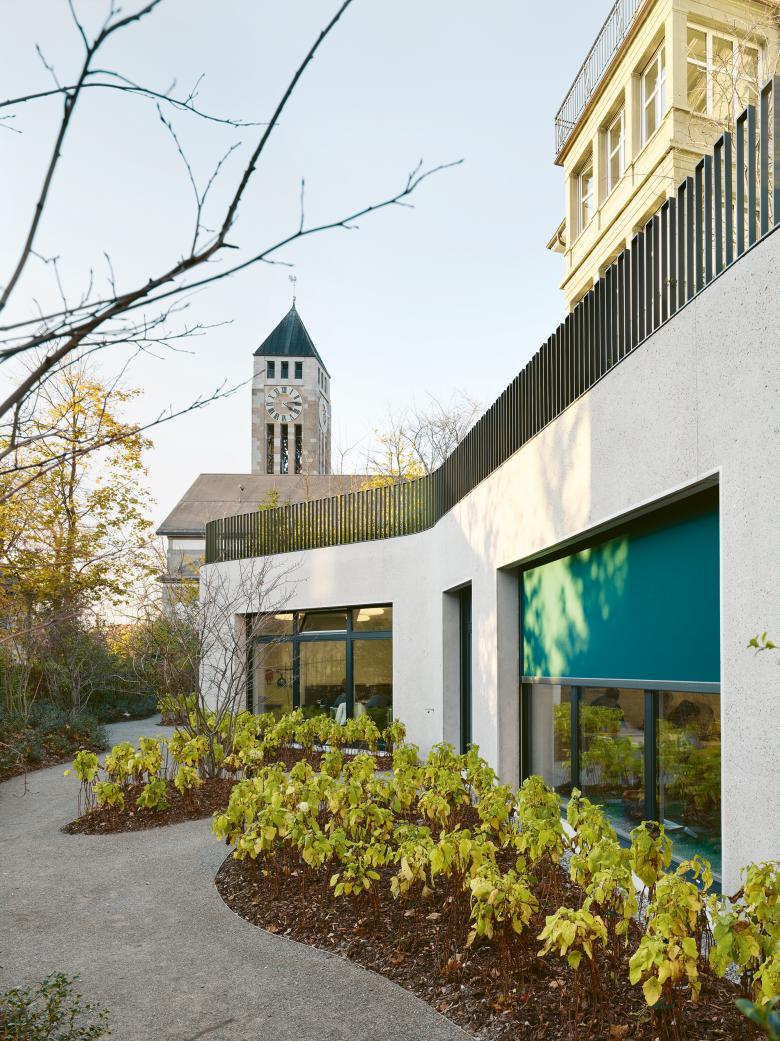 Precisely placed openings in the original outer wall spatially interweave the auditorium with the underground extension. The gently, amorphously curved classrooms in front of it stretch out towards the light and alternate with teacher preparation areas and group rooms. A carefully designed garden space has been created on the roof of the new building. Through the intervention, the main building, the ancillary building and the new basement are merged into one unit, while at the same time the independent expression of the individual parts is strengthened.