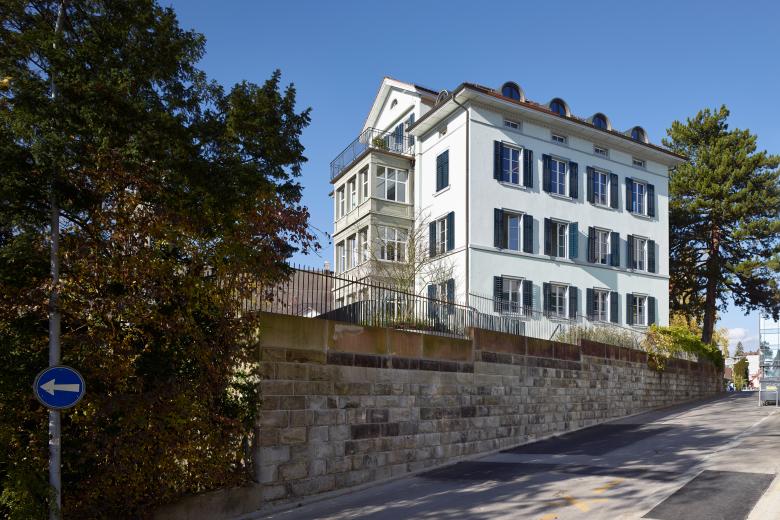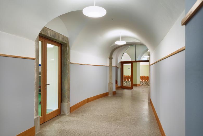 The existing late-classical ensemble comprising the main building and a carriage house is situated on Stapferstrasse on a hilltop in Zurich’s Oberstrass quarter. Now preservation-listed, the structure was built in 1855 as an apartment building. The underground vaults correspond to the orientation of a previous house with a winepress that dates back to the 17th century. Since 1943, the main building and carriage house have been used as a school by the Neue Schule Zürich. Additional classrooms and group rooms required to meet contemporary teaching needs were built in the basement around the historical building.