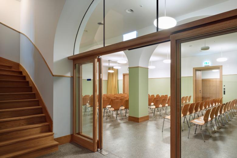 A plinth is thus created which frames and encloses the old building. The new basement can be reached by an extension of the existing staircase, as well as through a garden entrance. The connection from the carriage house to the auditorium was re-established through the historical vaulted corridor and the remaining stone framing was exposed. The existing assembly hall thus becomes a new central space.