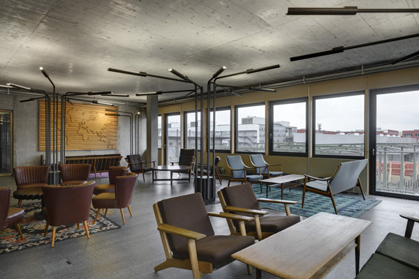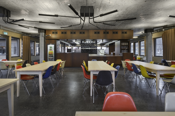 The roof top canteen is an integral part of a commercial building complex in the north of Zürich. It is used mainly between the two tenants – Freitag and Aroma. The kitchen for the canteen, along with the integrated refrigeration units sits like an island within a large open space. This main space is divided into two parts to create a restaurant area and a lounge area. Visitors are naturally guided through the various buffet areas within the restaurant. Both spatial zones have additional furniture and integrated ponds and fireplaces. The vintage lounge furniture is from Denmark and the restaurant area is dotted with colourful Eames chairs.