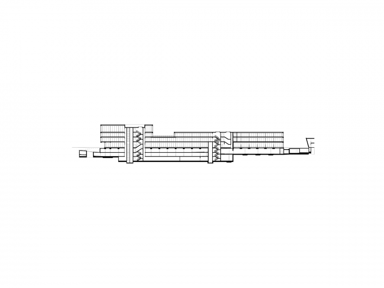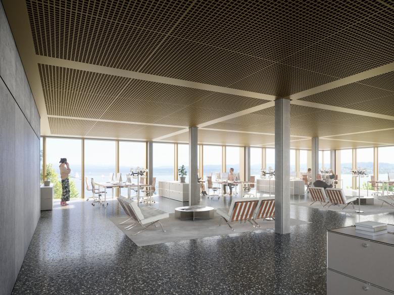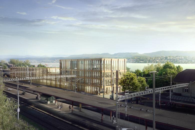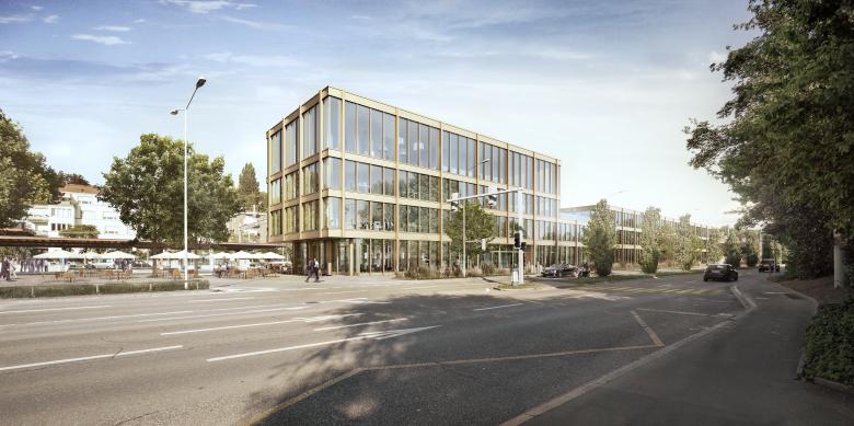 The architectural language of this commercial development, with a length of 135 meters, references buildings by Jakob Zweifel and Franz Füeg along Bellerivestrasse, following the tradition of these post-war commercial headquarters. The finely structured urban volume of the proposed building adopts a vertical segmentation: an elevated, high basement level, a central section, and a high attic level, distinctly designed as a crowning structure. The attic's size is compressed, which develops a head-end configuration and is followed by a longitudinal development made possible by an incision beneath the permissible standard floor height. The head-end harmonizes with the existing station building to shape a new urban station square.