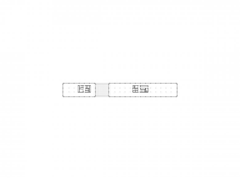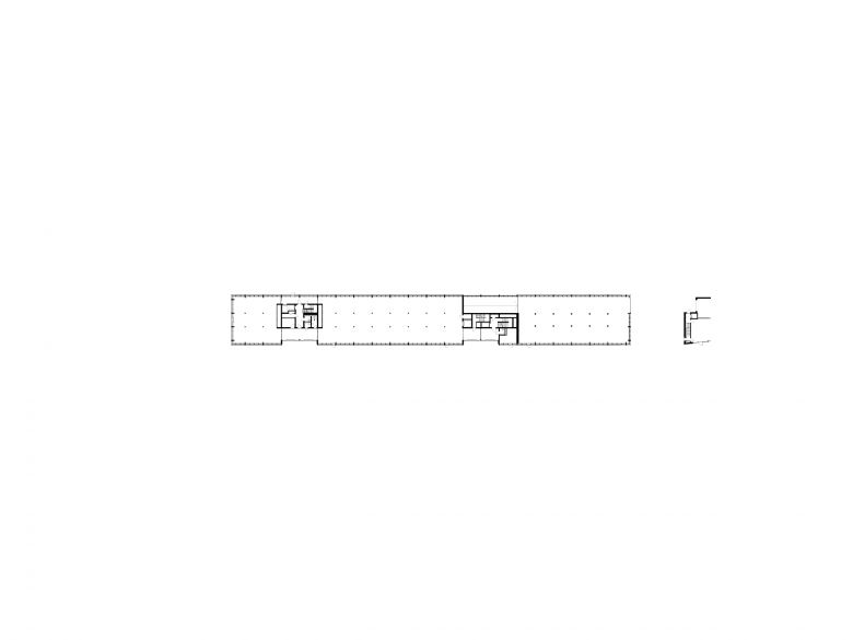 Two off-centered cores structure the open floors borne by concrete lumbar supports. A glass building envelope with a 1.5-meter grid provides both views through and into the volume, surrounded by irregularly and playfully positioned vertical façade pilasters made of anodized aluminum.