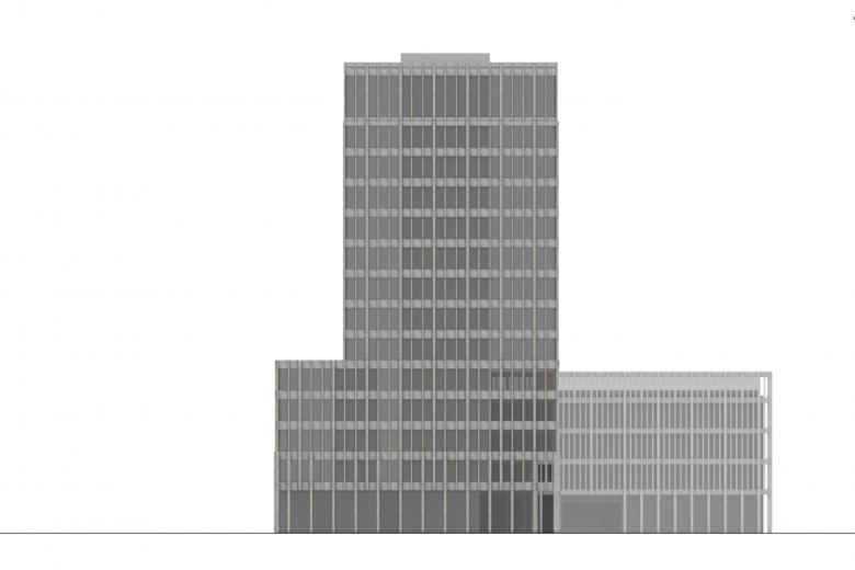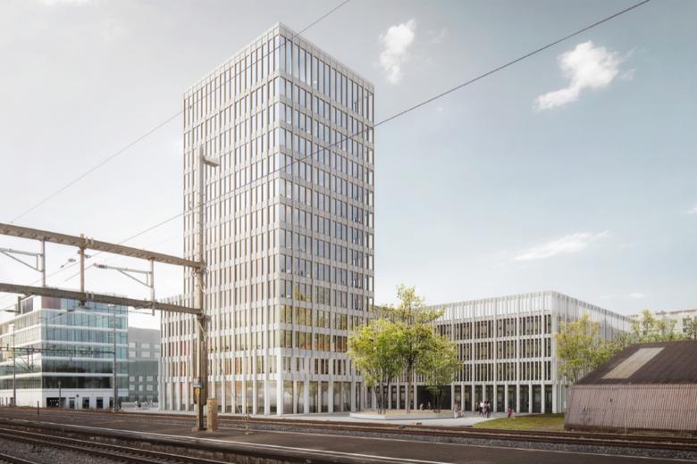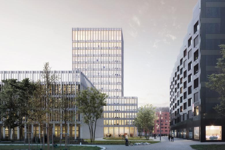 This feasibility study evaluates the potential of a central site near the train station in Schlieren, a town located in the Limmattal river valley in the canton of Zurich . The proposed solution recommends refurbishing an existing ‘80s-era office block, cladding it in an updated façade , and pairing its horizontal massing with a striking new tower. The façades of the old and new volumes are visually linked through a common design language; together, they form a well-balanced, cohesive, and inviting ensemble.