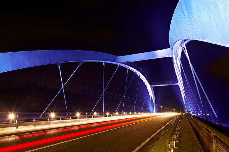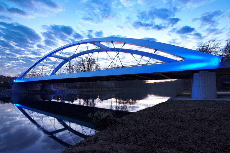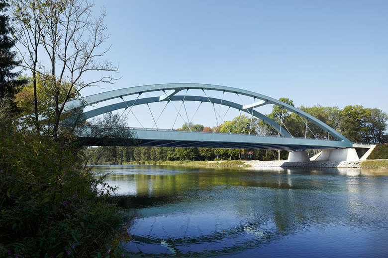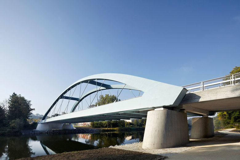 Dominantes Gestaltungselement des neuen Bauwerkes ist die Stabbogenbrücke. Die Bogenscheiben wurden im Querschnitt zueinander geneigt und im oberen Bereich mit Querträgern verbunden, so dass eine Torwirkung entsteht. Die Neigung der Bogenscheiben wurde konsequent auch in der Geometrie der Unterbauten fortgesetzt. Die gekreuzten Hänger ergänzen die Charakteristik der Stabbogenbrücke.
