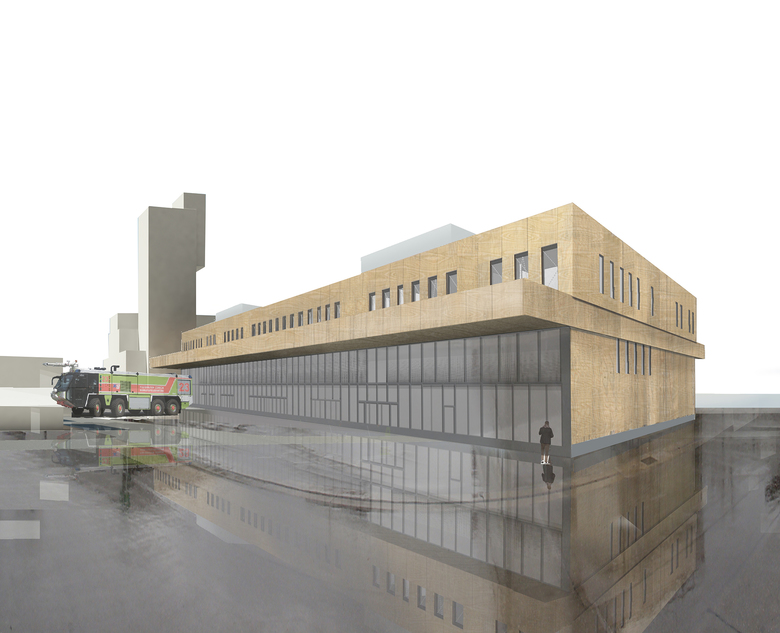 Was wäre der Flughafen Zürich ohne eine Feuerwehr? Das Gebäude dazu ist pragmatisch. Eine Ebene Handwerk, eine Ebene Fahrzeuge, eine Ebene Wohnen. Unten die Arbeit, oben das Vergnügen und die Erholung. Alles ist praktisch, robust, strapazierbar, ökonomisch, clever. Abgestimmt auf die Bedürfnisse. Der rechteckige Körper wird seitlich aufgeklappt, genannt Vordach. Dazu wird er ausgeschnitten, damit es Luft zwischen den Ruhe- und Schlafräumen gibt. Materialien und Farben unterstützen Organisation, Atmosphäre und verbinden die Ebenen.