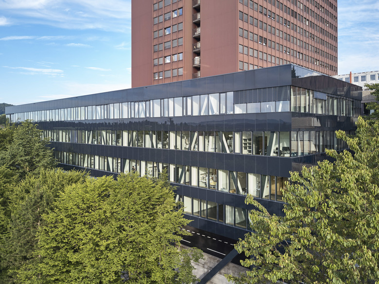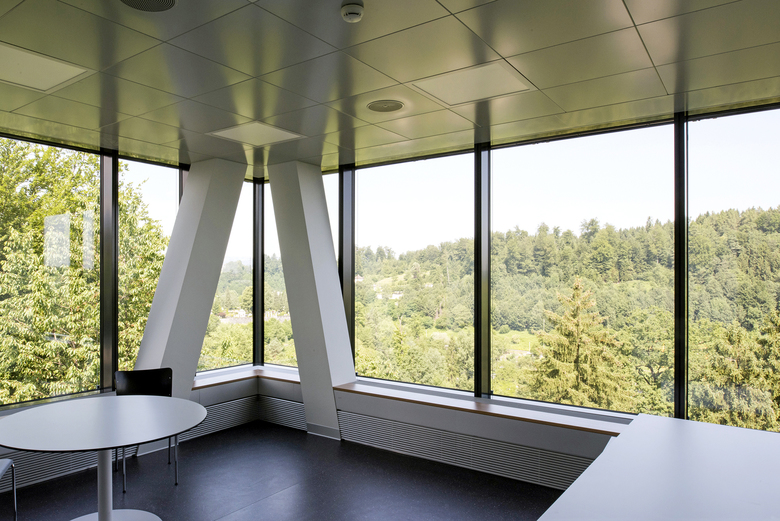 Das neue Zentrum für Notfall- und Intensivmedizin kommt voll zum Tragen. Von Anfang an musste Rechnung getragen werden, dass die Notfallzufahrt auch während des Baus in Betrieb blieb. Das viergeschossige Gebäude trägt es mit Fassung und stellt gleichzeitig sein Tragwerk zur Schau. Es trägt nicht dick auf, sondern verhüllt die Konstruktion hinter gläserner Horizontalität, die je nach Tageszeit, Wetter und Beleuchtung leicht spiegelt. Im Inneren war Flexibilität gefordert – die verschiedenen Nutzungen der Geschosse bedingten sehr unterschiedliche Grundrisse, bieten gleichzeitig Raum für modernste, lean-optimierte Spitaltechnik mit viel Übersicht und Aussicht für Patienten in schwierigen Situationen.