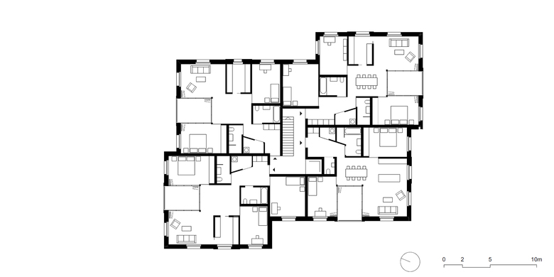 Sich anpassen, ohne unterzugehen. Sich integrieren, aber immer noch man selber bleiben. Das Mehrfamilienhaus schafft das. In einer Siedlung mit Gebäuden aus den 20er- und 30er-Jahren des letzten Jahrhunderts findet sich architektonisch Wertvolles in Serie und Villa. Das führt der Neubau zusammen und weiter. Mit einem Quadrat pro Element, mit offenen und leeren Feldern, mit Eck- und Mittelfeldern. Ineinander gesteckt und in der dritten Dimension geöffnet, entstehen klare Bezüge und Wege.