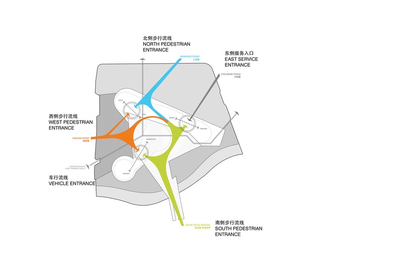 Located in the Zhangjiang District of Shanghai, to the east of Pudong, Shanghai Future Park is the meant to form a new centerpiece for the expansion a current technology development intended district. The complex project site borders many different conditions—it is bounded by the urban thoroughfares of Chuanhe Road and Naxian Road to east and west, and the Chuanyang and Zhihui Rivers to the north and south. The site also serves as the terminus of the major public axis of Baiye Road, a planted urban boulevard to the south of the site.