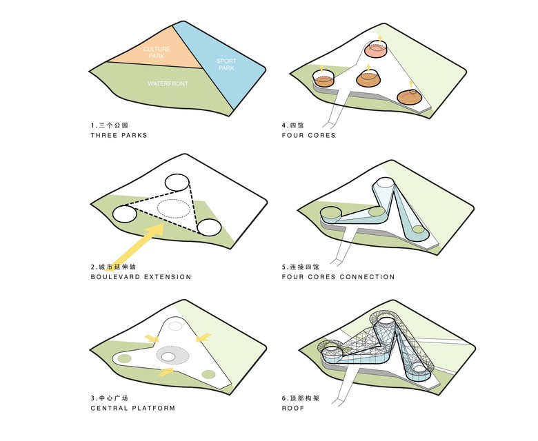 Link-Arc began from the outside in, proposing three civic spaces, each with different usage and character, and defined by a specific relationship to the site and context. To the north and east, a Sports Park incorporates playing fields and athletic facilities and connects to existing running paths along the banks of Chuanyang River. To the west, a civic plaza called the Culture Park serves as the main public entrance and is defined by a generous public stair. To the south, a Riverbank Park, defined by expansive river views and generous plantings, creates a major new civic amenity, extends the green space of Baiye Road, and increases public connectivity in the region. These spaces are connected via a raised central platform.
