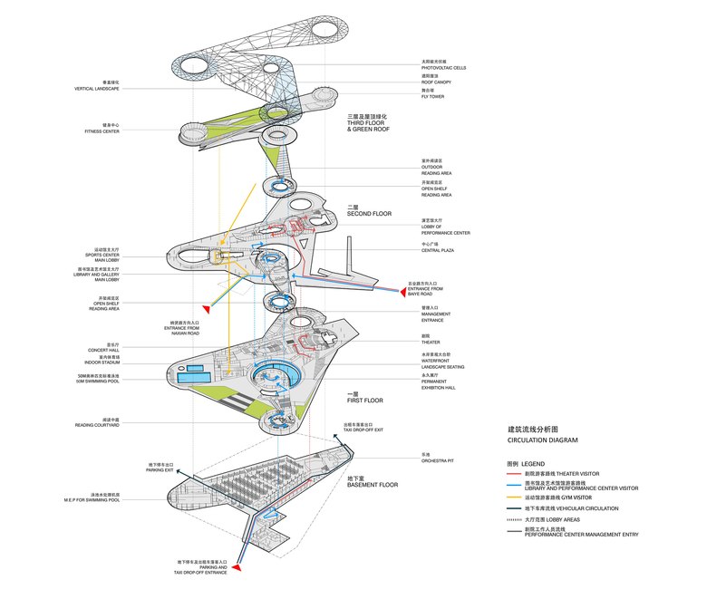 These spaces are sheltered by a lightweight roof structure which creates a grand civic gesture and unifies the distinct public spaces while reinforcing their individual characteristics. The roof extends over the public stairs of the Culture Park to shelter the main public entrance but is withdrawn from the Riverbank Park to create an open public space adjacent to the Zhihui River with panoramic views of the water and the cityscape beyond. In addition, the roof generates the architecture beneath by implying locations for major programmatic elements.