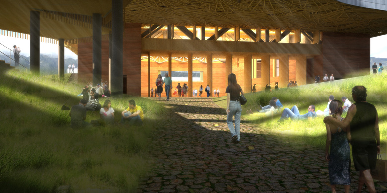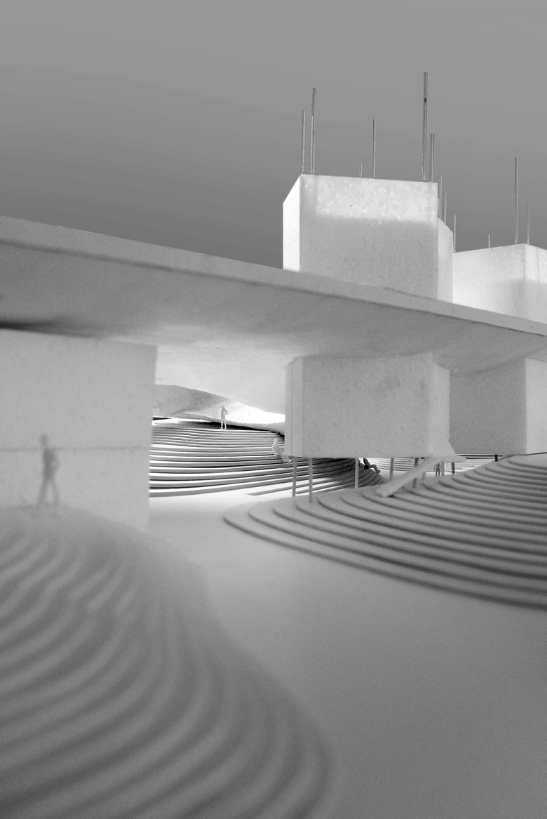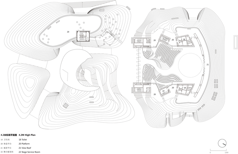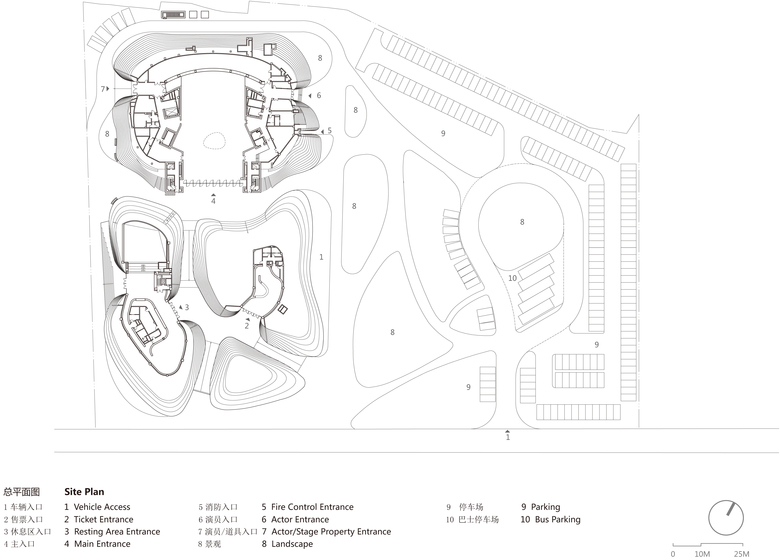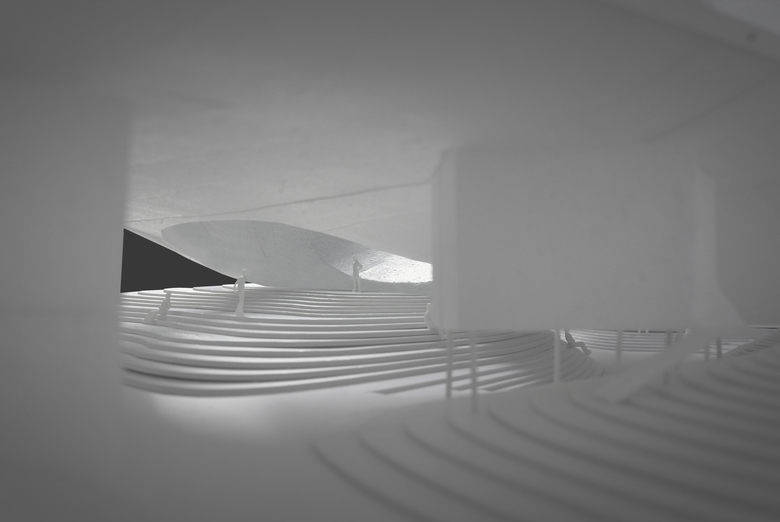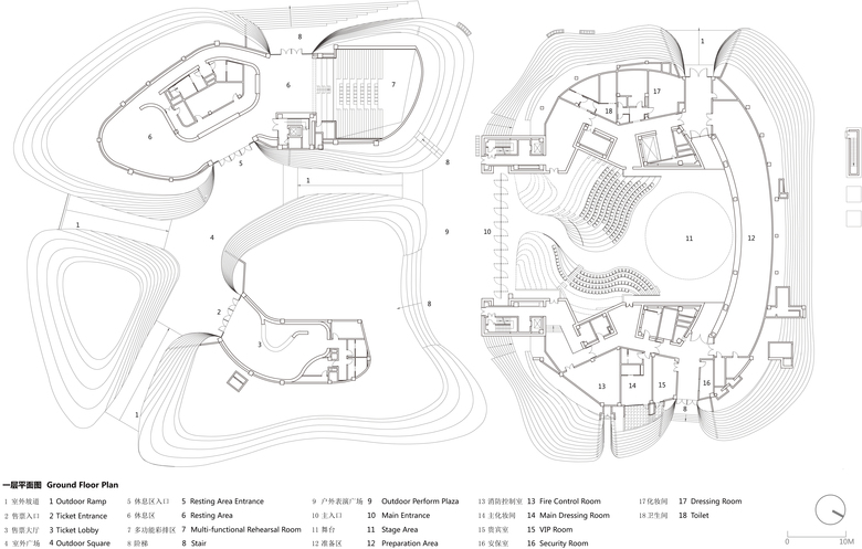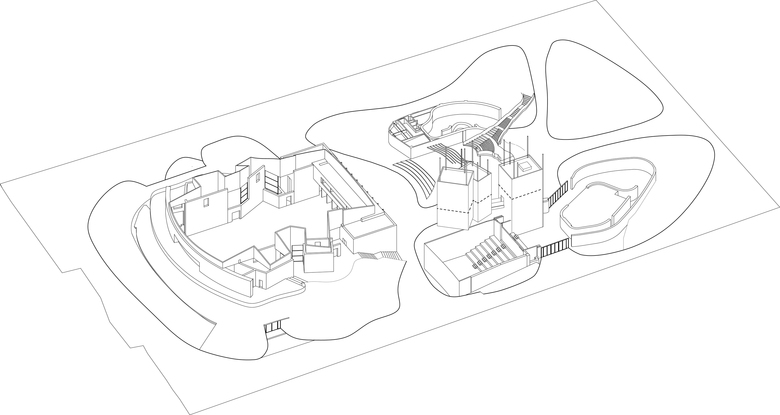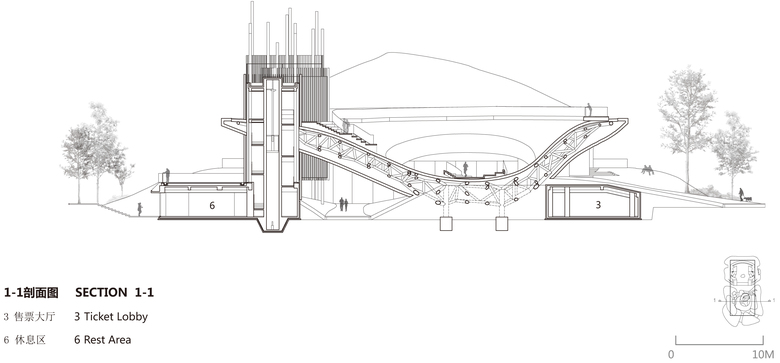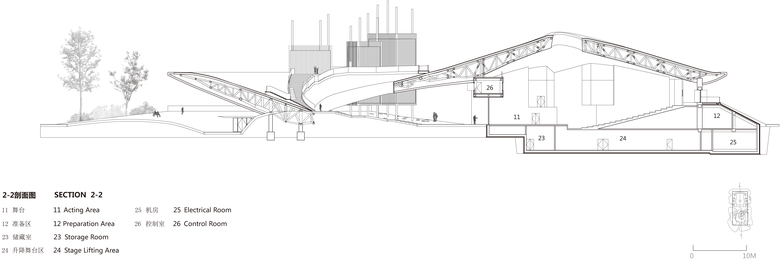 作为一个表演建筑,本设计采用建筑与景观地形一体化的形式,探求为新的表演方式提供多种可能性,使得表演活动不止能发生在传统的剧场内部,也可以发生在庭院中,发生在内外连接处的半室外空间,从而使艺术表演围绕着建筑内外,在不同尺度的舞台上发生,创造了天然又独特的表演与观演形式,使建筑不论自内而外还是自外而内都充满活力。同时人的活动空间也被设计的充满多元性与丰富性,剧场内部,庭院之中,依附草坡,屋檐之上,以及基地周边的连续性的景观设计,都将人群吸引进来。大理古城依山傍水,山水相映,建筑水印苍山,在曼妙的自然环境与艺术表演中生发出与众不同的活力与情感。